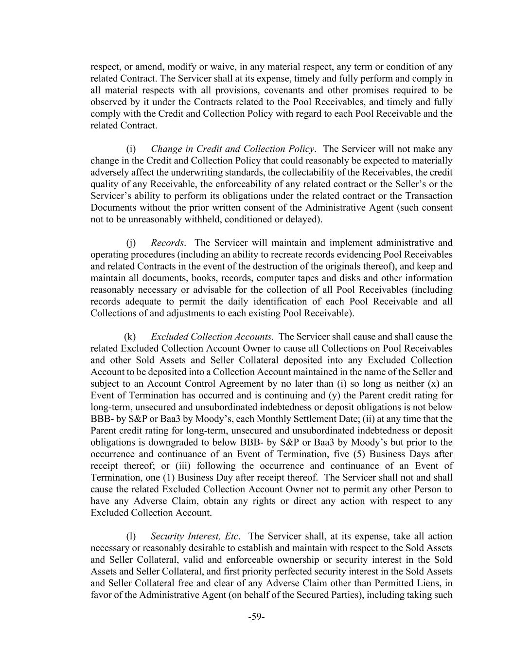 -59-在任何重大方面尊重、或修订、修改或放弃任何相关合同的任何条款或条件。服务商应自费、及时、全面履行并在所有重大方面遵守其在与池应收款有关的合同项下要求遵守的所有条款、契诺和其他承诺,并及时、全面遵守与各池应收款和相关合同有关的信贷和收款政策。(i)信贷和催收政策的变化。服务商不会对信贷和催收政策作出任何可合理预期会对承保标准、应收款项的可收回性、任何应收款的信用质量、任何相关合同的可执行性或卖方或服务商在未经行政代理人事先书面同意(此种同意不得被无理拒绝、附加条件或延迟)的情况下履行其在相关合同或交易文件下的义务的能力产生重大不利影响的变更。(j)记录。服务商将维护和执行行政和操作程序(包括在池应收款和相关合同原件被销毁时重新创建证明池应收款和相关合同的记录的能力),并保存和维护所有文件、簿册、记录、计算机磁带和磁盘以及收集所有池应收款合理必要或可取的其他信息(包括足以允许每天识别每个池应收款以及每个现有池应收款的所有收集和调整的记录)。(k)不包括的收款账户。服务商应促使并应促使相关的排除收款账户所有者促使存入任何排除收款账户的池应收款和其他出售资产以及卖方抵押品的所有收款在不迟于(i)之前存入以卖方名义维持并受账户控制协议约束的收款账户,只要(x)终止事件未发生且仍在继续,以及(y)长期、无担保和非次级债务或存款义务的母公司信用评级不低于标普的BBB-或穆迪的Baa3,每个月的结算日;(ii)在长期、无担保和非次级债务或存款债务的母公司信用评级被标普下调至BBB-以下或被穆迪下调至Baa3但在终止事件发生和持续之前的任何时间,在收到该事件后五(5)个工作日;或(iii)在终止事件发生和持续之后,在收到该事件后一(1)个工作日。服务商不得也不得促使相关的排除收款账户所有者允许任何其他人就任何排除收款账户提出任何不利索赔、获得任何权利或指示任何行动。(l)担保权益等。服务商应自费采取一切必要或合理可取的行动,以有利于行政代理人(代表有担保当事人)确立和维持与出售资产和卖方担保物、出售资产和卖方担保物上有效和可执行的所有权或担保权益,以及第一优先权完善出售资产和卖方担保物上的担保权益,不存在除允许的留置权以外的任何不利债权,包括采取此类