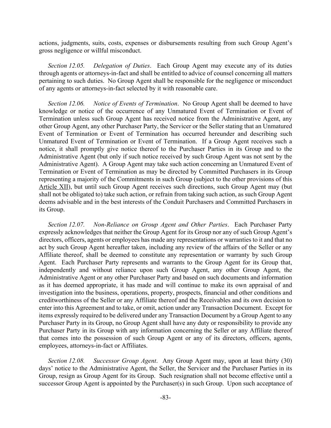 -83-该集团代理人的重大过失或故意不当行为导致的诉讼、判决、诉讼、成本、费用或支出。第12.05节。授权职责。每个集团代理人可通过代理人或事实上的律师执行其任何职责,并有权就与该职责有关的所有事项获得律师的建议。任何集团代理人不得对其合理谨慎选择的任何代理人或事实上的律师的疏忽或不当行为负责。第12.06节。终止事项的通知。任何集团代理人不得被视为知悉或通知任何未成熟的终止事件或终止事件的发生,除非该集团代理人已收到行政代理人、任何其他集团代理人、任何其他买方方、服务商或卖方的通知,说明本协议项下已发生未成熟的终止事件或终止事件,并描述该未成熟的终止事件或终止事件。集团代理人收到此种通知的,应当及时向其集团内的买方当事人和行政代理人发出通知(但仅限于该集团代理人收到的此种通知不是由行政代理人发出的)。集团代理人可就未成熟的终止事件或终止事件采取其集团内代表该集团内大多数承诺的承诺买方可能指示的行动(以本条第十二条其他规定为准),但在该集团代理人收到该等指示之前,该集团代理人可(但无义务)采取该等行动,或不采取该集团代理人认为可取且符合其集团内管道买方和承诺买方最佳利益的该等行动。第12.07节。不依赖集团代理和其他方。各买方均明确承认,其集团的集团代理或该集团代理的任何董事、高级职员、代理或雇员均未向其作出任何陈述或保证,且该集团代理此后采取的任何行为,包括对卖方或其任何关联公司事务的任何审查,均不应被视为构成该集团代理的任何陈述或保证。每一买方向其集团的集团代理人声明并保证,独立且不依赖该集团代理人、任何其他集团代理人、行政代理人或任何其他买方并基于其认为适当的文件和信息,其已并将继续自行评估和调查卖方或其任何关联公司的业务、运营、财产、前景、财务和其他条件以及信誉和应收账款,并自行决定订立本协议,并采取或省略,根据任何交易文件采取的行动。除集团代理人根据任何交易文件明确要求交付给其集团内任何买方一方的物品外,任何集团代理人均无义务或责任向其集团内任何买方一方提供该集团代理人或其任何董事、高级职员、代理人、雇员、事实上的律师或关联公司所掌握的有关卖方或其任何关联公司的任何信息。第12.08节。后继组代理。任何集团代理人可在至少提前三十(30)天通知行政代理人、其集团内的卖方、服务商和买方各方后,辞去其集团的集团代理人职务。在买方在该集团中指定继任集团代理人之前,该辞职不会生效。在这样接受