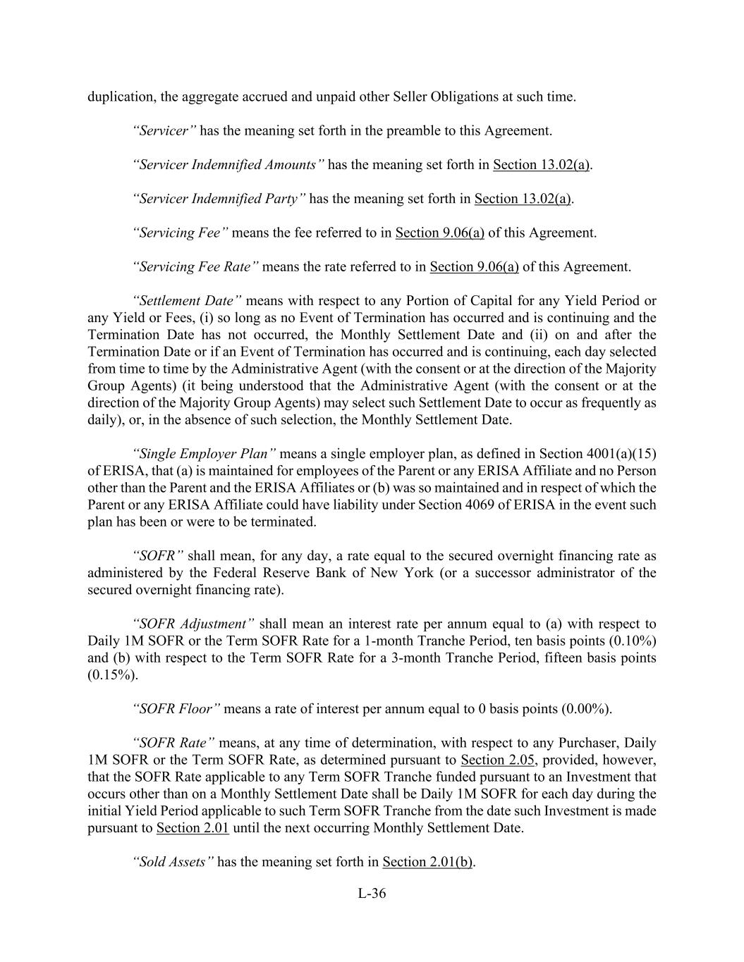 L-36重复,此时累计和未支付的其他卖方债务总额。“服务者”具有本协议序言部分所述的含义。“服务商赔偿金额”具有第13.02(a)节中规定的含义。“服务者受偿方”具有第13.02(a)节规定的含义。“服务费”是指本协议第9.06(a)节所指的费用。“服务费率”是指本协议第9.06(a)节所指的费率。“结算日”是指就任何收益期或任何收益或费用的任何部分资本而言,(i)只要没有发生终止事件并仍在继续,且终止日期没有发生,则每月结算日和(ii)在终止日期当日及之后,或如果终止事件已经发生并仍在继续,行政代理人(经同意或在多数群体代理人的指示下)不时选定的每一天(据了解,行政代理人(经同意或在多数群体代理人的指示下)可以选择该结算日期与日常一样频繁地发生),或在没有该选择的情况下,选择每月结算日期。“单一雇主计划”是指ERISA第4001(a)(15)节所定义的单一雇主计划,该计划(a)是为母公司或任何ERISA关联公司的雇员维持的,除母公司和ERISA关联公司以外的任何人或(b)是如此维持的,如果该计划已经或将要终止,则母公司或任何ERISA关联公司可能根据ERISA第4069条对此承担责任。“SOFR”是指在任何一天,等于由纽约联邦储备银行(或担保隔夜融资利率的继任管理人)管理的担保隔夜融资利率的利率。“SOFR调整”是指年利率等于(a)的每日1M SOFR或1个月分档期的定期SOFR利率,10个基点(0.10%)和(b)的3个月分档期的定期SOFR利率,15个基点(0.15%)。“SOFR下限”是指年利率等于0个基点(0.00个百分点)。“SOFR Rate”是指,在任何确定时间,就任何买方而言,每日1M SOFR或根据第2.05节确定的定期SOFR Rate,但条件是,适用于根据每月结算日期以外发生的投资资助的任何定期SOFR批次的SOFR Rate应为自根据第2.01节进行此类投资之日起至下一个发生的每月结算日期期间适用于该定期SOFR批次的初始收益期内每一天的每日1M SOFR。“出售资产”具有第2.01(b)节规定的含义。