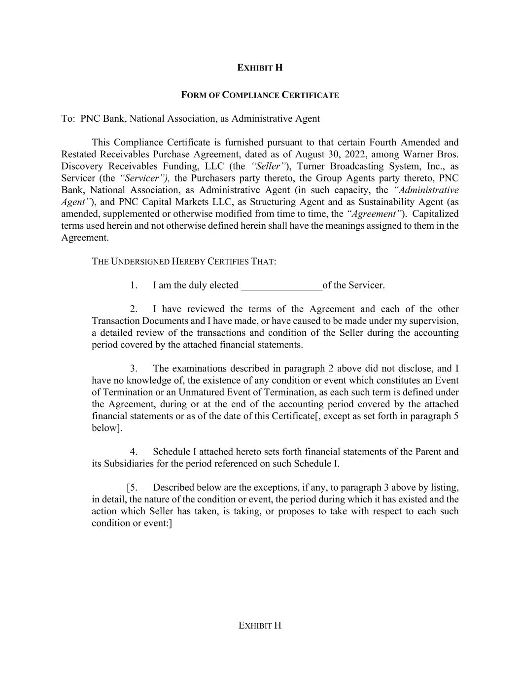 将符合条件的H表格H表格证书展示给:PNC银行,全国协会,作为行政代理人本合规证书是根据截至2022年8月30日Warner Bros. Discovery Receivables Funding,LLC(“卖方”)、Turner Broadcasting System,Inc.作为服务商(“服务商”)、买方一方、集团代理方、PNC银行、全国协会作为行政代理人(在此身份下称为“行政代理人”)和PNC Capital Markets LLC作为结构代理和可持续发展代理(经不时修订、补充或以其他方式修改,“协议”)。此处使用且未另行定义的大写术语应具有协议中赋予它们的含义。以下文在此证明:1。我是正式选出的______________的服务员。2.本人已审阅协议条款及其他各项交易文件,并已作出或已促使在本人监督下作出,详细审阅所附财务报表所涵盖的会计期间内卖方的交易及状况。3.上文第2段所述的检查没有披露,我也不知道是否存在构成终止事件或未成熟的终止事件的任何条件或事件,正如协议所定义的每一个此类术语,在所附财务报表所涵盖的会计期间期间期间或结束时或截至本证书之日[,但下文第5段规定的除外]。4.随附的附表I载列了母公司及其子公司在该附表I所指期间的财务报表。[ 5。下文通过详细列出条件或事件的性质、其存在的期间以及卖方就每一此类条件或事件已采取、正在采取或提议采取的行动,来描述上文第3段的任何例外情况:]