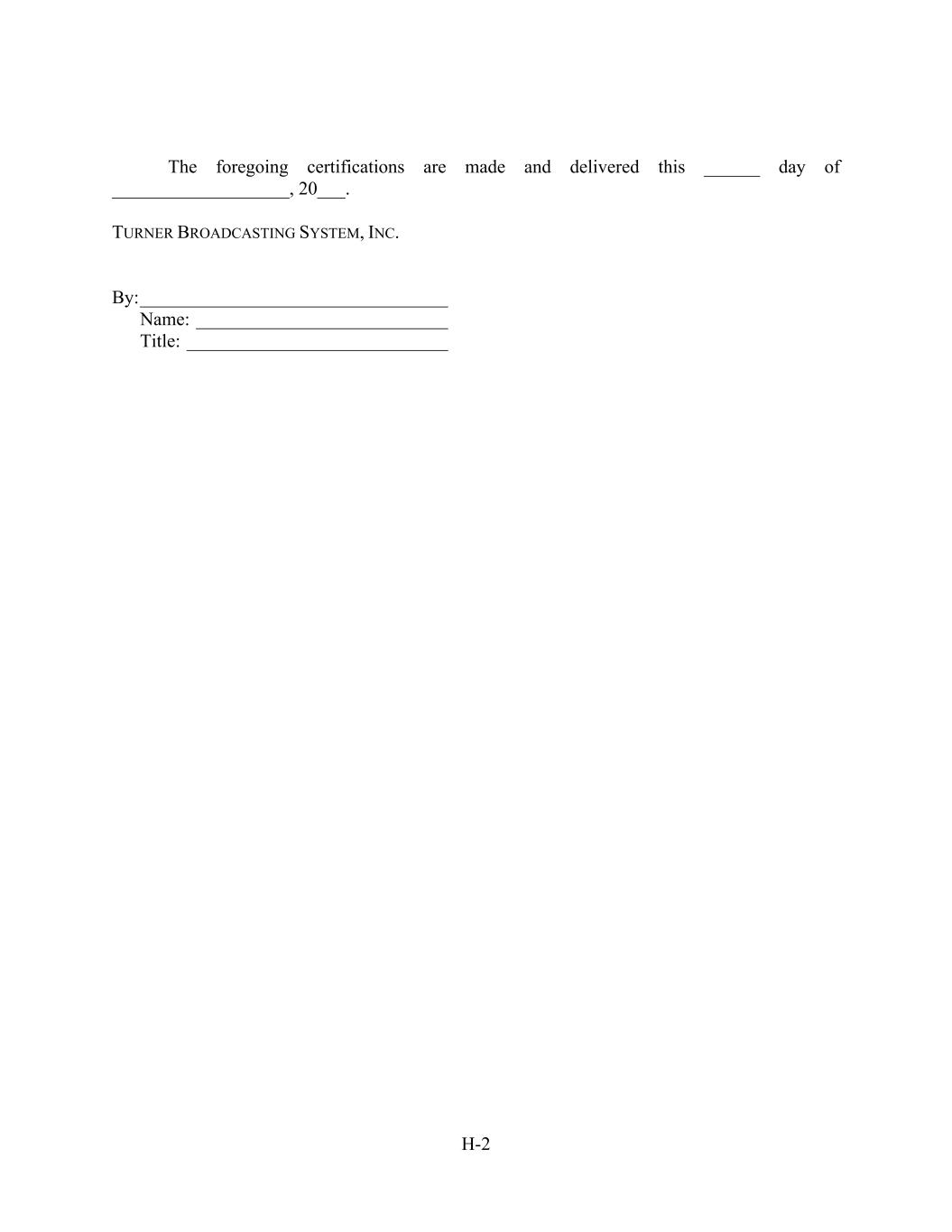 H-2上述认证是在____________________的这个_____日,20___日作出并交付的。特纳广播系统公司作者:_________________________________姓名:__________________________标题:______________________________