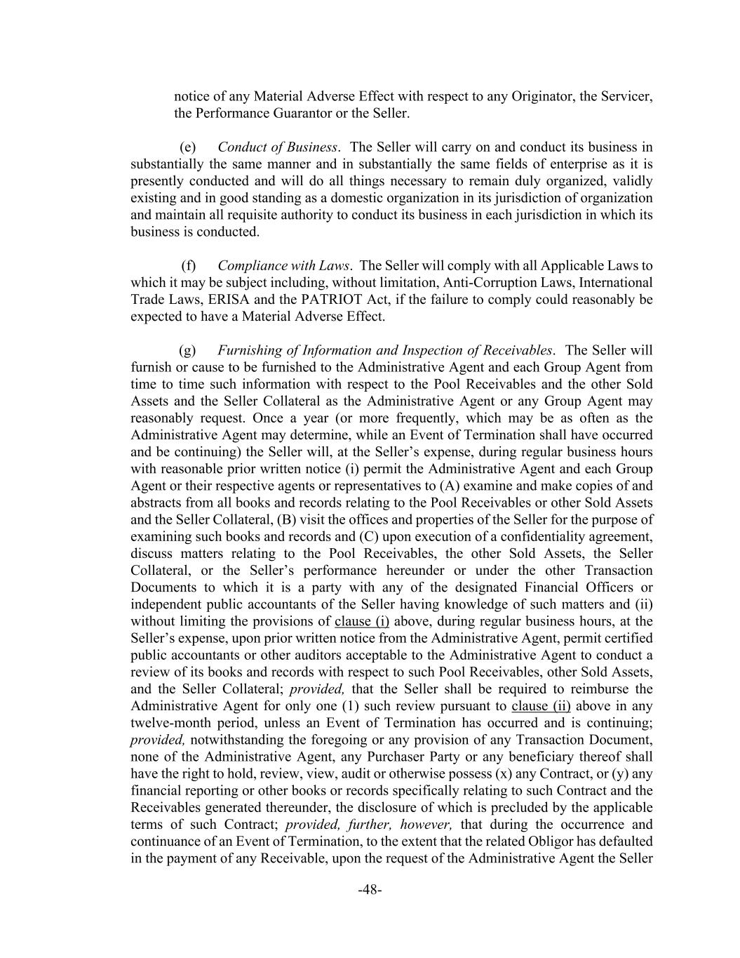 -48-关于任何发起人、服务商、履约保证人或卖方的任何重大不利影响的通知。(e)经营行为。卖方将以与目前开展业务基本相同的方式和在基本相同的企业领域开展和开展业务,并将采取一切必要措施,在其组织管辖范围内保持适当组织、有效存在和作为国内组织的良好信誉,并保持在其业务开展所在的每个管辖范围内开展业务的所有必要权力。(f)遵守法律。卖方将遵守其可能遵守的所有适用法律,包括但不限于反腐败法、国际贸易法、ERISA和《爱国者法案》,前提是可以合理地预期不遵守将产生重大不利影响。(g)提供资料和检查应收款。卖方将作为行政代理人或任何集团代理人可能合理要求的,不时向行政代理人和每个集团代理人提供或促使提供有关集合应收款和其他出售资产以及卖方抵押品的信息。每年一次(或更频繁地,可能是行政代理人可能确定的频率,而终止事件应已发生并仍在继续),卖方将在正常营业时间内(由卖方承担费用)以合理的事先书面通知(i)允许行政代理人和每个集团代理人或其各自的代理人或代表(a)检查和制作与集合应收款或其他出售资产和卖方抵押品有关的所有账簿和记录的副本和摘要,(b)访问卖方的办公室和物业,以检查这些簿册和记录,以及(c)在签署保密协议时,与卖方的任何指定财务官或独立公共会计师在正常营业时间内,讨论与集合应收款、其他出售资产、卖方抵押品或卖方根据本协议或根据其作为当事方的其他交易文件履行有关的事项,以及(ii)在不限制上文第(i)款规定的情况下,由卖方承担费用,经行政代理人事先书面通知,准许注册会计师或行政代理人可以接受的其他审计人员对其账簿和记录进行有关该等集合应收款、其他出售资产和卖方抵押品的审查;但须要求卖方在任何十二个月期间仅根据上文第(ii)款向行政代理人偿还一(1)项此类审查,除非终止事件已经发生并仍在继续;但尽管有前述规定或任何交易文件的任何规定,行政代理人均不得,任何买方一方或其任何受益人均有权持有、审查、查看、审计或以其他方式拥有(x)任何合同,或(y)任何财务报告或其他账簿或记录,具体涉及该合同及其下产生的应收款,而该合同的适用条款不允许披露这些账簿或记录;但进一步规定,在终止事件发生和持续期间,在相关债务人拖欠任何应收款付款的情况下,应行政代理人的请求,卖方