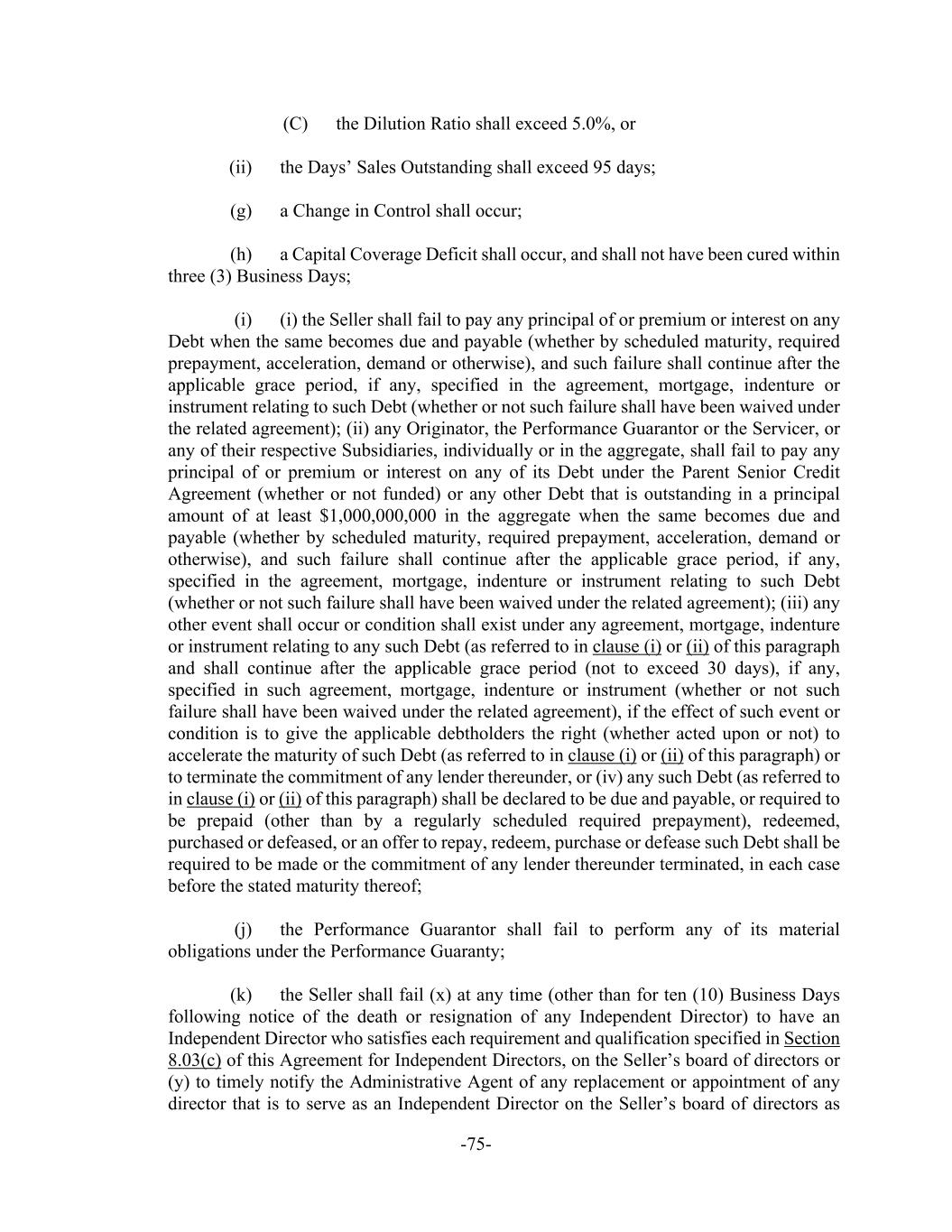 -75-(c)摊薄率应超过5.0%,或(ii)未完成销售的天数应超过95天;(g)控制权发生变更;(h)出现资本覆盖赤字,且在三(3)个营业日内未得到纠正;(i)(i)卖方在任何债务到期应付时(无论是通过预定到期、要求提前还款、加速偿还、要求偿还或其他方式)未能支付任何债务的本金或溢价或利息,且在协议、抵押、与该等债务有关的契约或文书(不论该等失败是否已根据相关协议获豁免);(ii)任何发起人、履约担保人或服务商,或其各自的任何附属公司,个别地或合计地,均不得支付其根据母公司优先信贷协议(不论是否获资助)的任何债务的任何本金或溢价或利息,或在到期应付时本金总额至少为1,000,000,000美元的任何其他未偿债务(不论是按预定期限、规定的提前还款、加速偿还,要求或其他方式),而该等不履行须在与该等债务有关的协议、抵押、契约或文书所指明的适用宽限期(如有的话)后继续(不论该等不履行须根据有关协议予以豁免);(iii)与任何该等债务有关的任何协议、抵押、契约或文书(如本款第(i)或(ii)款所提述,须在该等协议所指明的适用宽限期(如有的话不超过30天)后继续,抵押,契约或文书(不论是否根据相关协议放弃该等失责),如该等事件或条件的影响是给予适用的债务持有人加速该等债务到期的权利(不论是否采取行动)(如本款第(i)或(ii)款所指)或终止任何贷款人在该等债务下的承诺,或(iv)任何该等债务(如本款第(i)或(ii)款所指)须宣布到期应付,或被要求预付(定期安排的要求预付款项除外)、赎回、购买或取消,或要求作出偿还、赎回、购买或取消该等债务的要约,或终止任何贷款人根据该等要约作出的承诺,在每种情况下,在其规定的到期日之前;(j)履约保证人不得履行其在履约保函下的任何重大义务;(k)卖方不得在任何时间(任何独立董事死亡或辞职通知后的十(10)个工作日除外)未能(x)有一名独立董事满足本协议第8.03(c)节规定的独立董事的各项要求和资格,于卖方董事会或(y)将任何拟于卖方董事会担任独立董事的董事的任何更替或委任及时通知行政代理人为