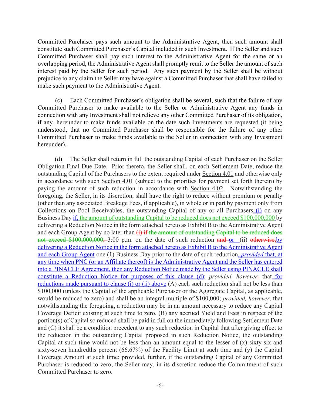 -6-承诺购买者向行政代理人支付该金额,则该金额应构成该承诺购买者包含在该投资中的资本。卖方与该承诺买方应向行政代理人支付同一期间或重迭期间利息的,行政代理人应及时将卖方已支付该期间利息的金额汇给卖方。卖方的任何此类付款均不影响卖方可能对未向行政代理人支付此类款项的承诺买方提出的任何索赔。(c)每一承诺买方的义务应是若干项,因此,任何承诺买方未能向卖方或行政代理人提供与任何投资有关的任何资金,不应解除任何其他承诺买方根据本协议承担的在要求此类投资之日提供资金的义务(如果有的话)(据了解,任何承诺买方均不应对任何其他承诺买方未能就本协议项下的任何投资向卖方提供资金负责)。(d)卖方应在卖方债务最后到期日全额返还各买方的未偿还资本。在此之前,卖方应在每个结算日将买方的未偿资本减少到第4.01节要求的范围内,否则只能按照该第4.01节(受其中规定的支付优先权的限制),方法是按照第4.02节支付此类减少的金额。尽管有上述规定,卖方仍有权酌情通过仅从集合应收账款收款中支付的方式全部或部分减少任何或所有买方(i)在任何营业日的未偿资本,而无需支付溢价或罚款(如适用,则不包括任何相关的破碎费),如果,拟减少的未偿还资本金额不超过100,000,000美元,方法是在不迟于(i)如拟减少的未偿还资本金额不超过100,000,000美元的情况下,在(i)该等减少日期的下午3:00或(ii)否则,在该等减少日期的前一(1)个营业日,向行政代理人及各集团代理人交付以本文件所附表格(该等减少通知)(该等减少日期的一(1)个营业日之前,以该等减持通知(该等减持通知以该等减持通知的形式)(该等减持通知以该等减持通知的方式)向行政代理人及各集团代理人交付该等减持通知,该等减持通知的方式为(1)个营业日之前在PNC(或其关联公司)作为行政代理人且卖方已签订PINACLE协议的任何时间,则卖方使用PINACLE作出的任何减持通知应构成就本(d)条而言的减持通知;但前提是,对于根据上述(a)条第(i)或(ii)款进行的减持,每次此类减持不得低于100,000美元(除非适用的买方的资本或适用的总资本将减至零),并应是100,000美元的整数倍;但前提是,尽管有上述规定,减少的金额可能是将当时存在的任何资本覆盖赤字减少至零所需的金额,(b)如此减少的资本部分的任何应计收益率和费用应在紧接下一个结算日期全额支付,以及(c)任何此类资本减少的先决条件是,在该减少通知中提议的未偿资本减少生效后,当时的未偿还资本将不低于相当于当时融资限额的(x)六十六和六十七百分之一(66.67%)和(y)当时的资本保障金额中较低者的金额;此外,如果任何承诺买方的未偿还资本减少为零,卖方可酌情将该承诺买方的承诺减少为零。