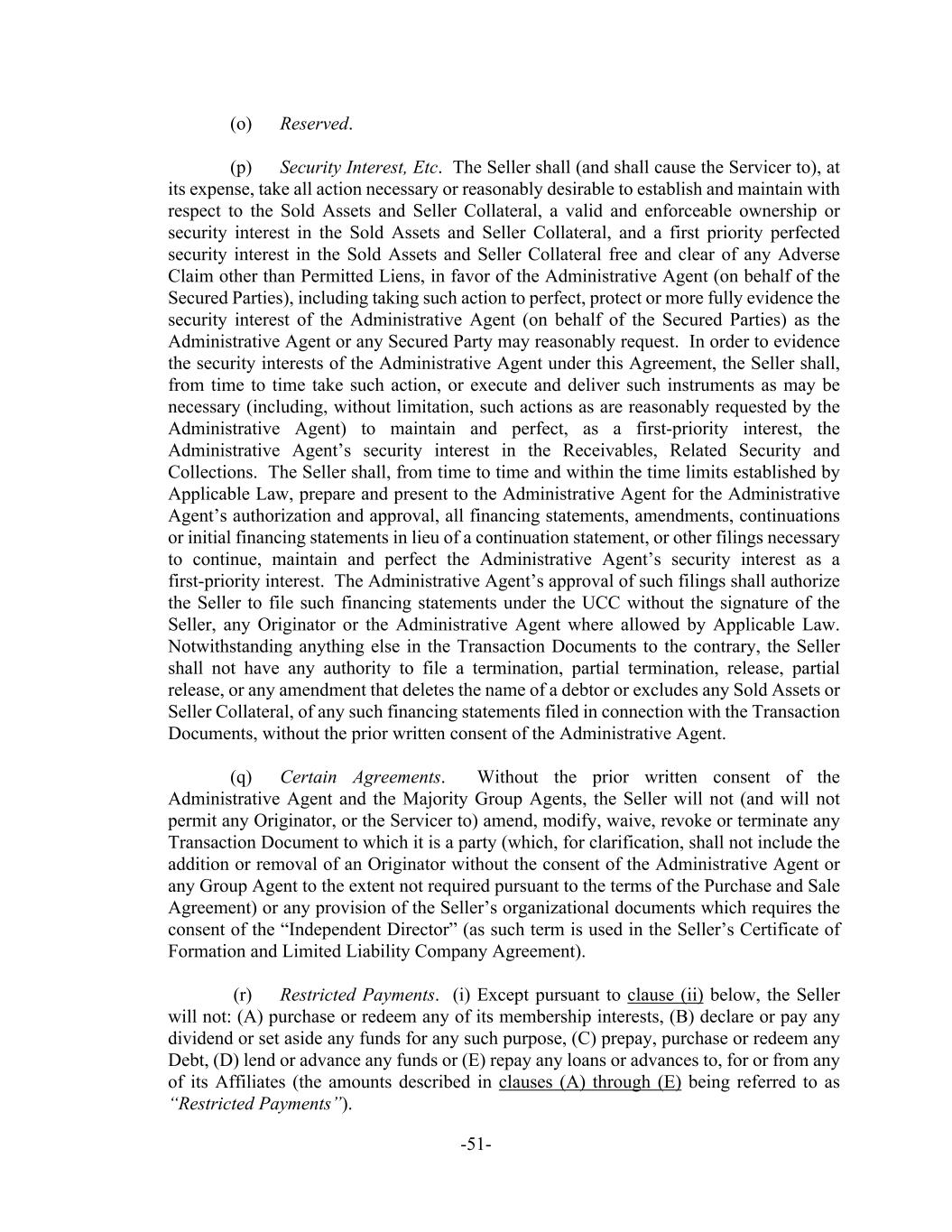 -51-(o)保留。(p)担保权益等。卖方应(并应促使服务商)自费采取一切必要或合理可取的行动,以建立和维持关于出售资产和卖方抵押品、出售资产和卖方抵押品的有效和可执行的所有权或担保权益,以及出售资产和卖方抵押品的第一优先权完善的担保权益,不存在除允许的留置权之外的任何不利债权,有利于行政代理人(代表有担保方),包括采取此类行动完善,保护或更充分地证明行政代理人(代表有担保方)作为行政代理人或任何有担保方可以合理要求的担保权益。为证明行政代理人在本协议项下的担保权益,卖方应不时采取行动,或签立和交付可能需要的文书(包括但不限于行政代理人合理要求的行动),以维持和完善行政代理人在应收款、相关担保和收款中的担保权益,作为第一优先权权益。出卖人应当在适用法律规定的期限内,不定期编制并向行政代理人提交经行政代理人授权批准的所有融资报表、修改、延续或初始融资报表,以代替延续报表,或为延续、维持和完善行政代理人作为第一优先权益的担保权益所必需的其他备案。行政代理人对此类备案的批准,应授权卖方在适用法律允许的情况下无需卖方、任何发起人或行政代理人签名即可在UCC下提交此类融资报表。尽管交易文件中有任何其他相反的规定,未经行政代理人事先书面同意,卖方无权对就交易文件提交的任何此类融资报表提出终止、部分终止、解除、部分解除或任何删除债务人名称或排除任何已出售资产或卖方抵押品的修改。(q)某些协议。未经行政代理人和多数群体代理人的事先书面同意,卖方不会(也不会允许任何发起人或服务商)修改、修改、放弃、撤销或终止其作为一方当事人的任何交易文件(为澄清起见,不得包括未经行政代理人或任何集团代理人同意而在根据买卖协议条款不需要的范围内增加或移除发起人)或卖方组织文件中需要“独立董事”同意的任何条款(因为该术语在卖方的成立证明和有限责任公司协议中使用)。(r)限制性付款。(i)除根据下文第(ii)条外,卖方不会:(a)购买或赎回其任何会员权益,(b)宣派或支付任何股息或为任何该等目的拨出任何资金,(c)预付、购买或赎回任何债务,(d)出借或垫付任何资金,或(e)向其任何关联公司、为其或从其任何关联公司偿还任何贷款或垫款((a)至(e)条所述的金额称为“限制性付款”)。