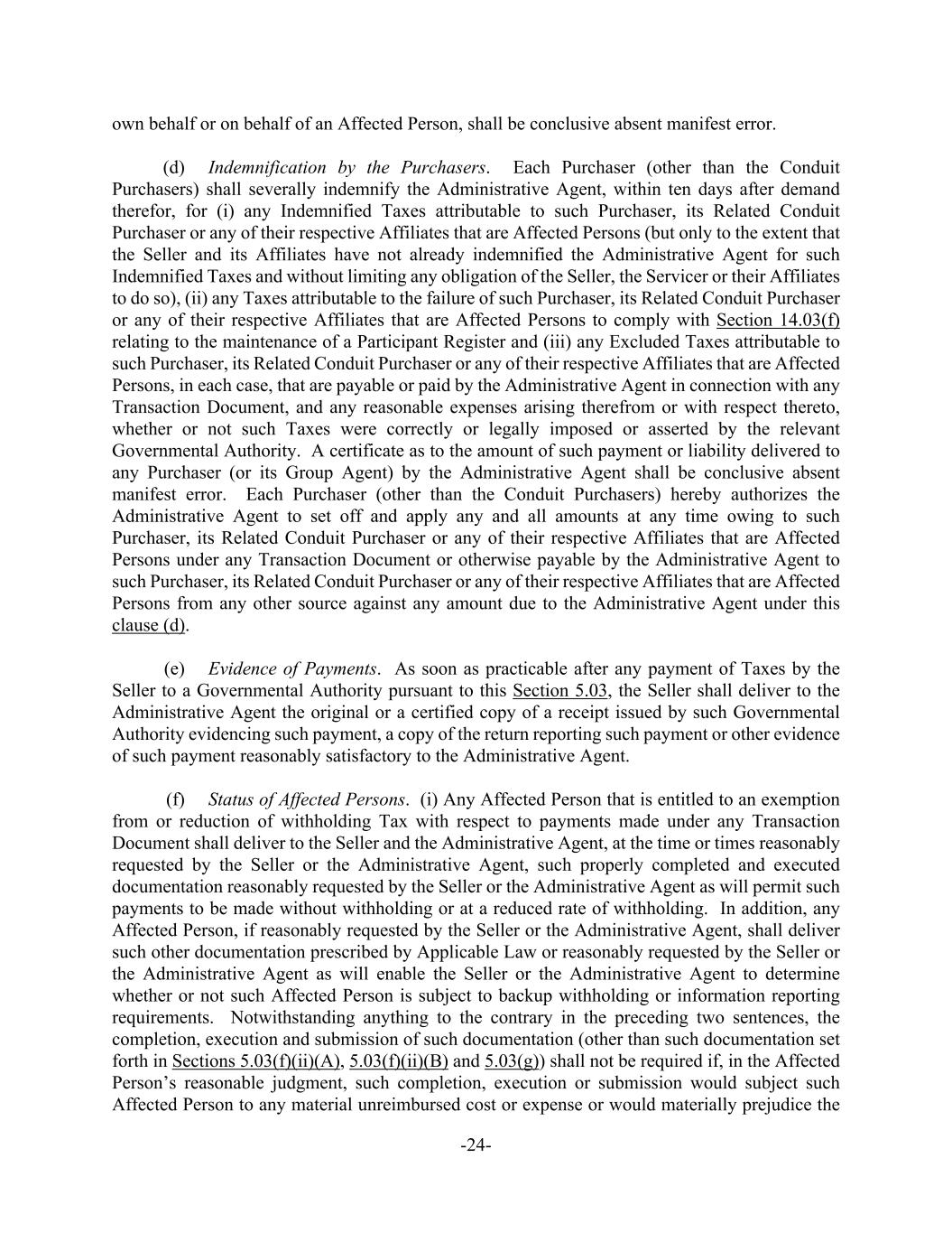 -24-自己或代表受影响者,应为无明显错误的结论性意见。(d)买方的赔偿。各买方(导管买方除外)应在要求后十天内就(i)归属于该买方、其相关导管买方或其各自的任何受影响人员的任何受补偿税款(但仅限于卖方及其关联公司尚未就该等受补偿税款向行政代理人进行补偿且不限制卖方、服务商或其关联公司这样做的任何义务的范围内),(ii)可归属于该买方失败的任何税款,其相关的管道买方或其各自的任何受影响人士的关联公司须遵守有关维持参与者名册的第14.03(f)节,以及(iii)在每种情况下由行政代理人就任何交易文件应付或支付的可归属于该买方、其相关管道买方或其各自的任何受影响人士的关联公司的任何除外税款,以及由此产生或与之相关的任何合理费用,无论这些税款是否由相关政府当局正确或合法征收或主张。行政代理人向任何买方(或其集团代理人)交付的有关该等付款或赔偿责任金额的证明,无明显错误,即为结论性证明。各买方(导管买方除外)特此授权行政代理人在任何时间抵销及适用根据任何交易文件欠该买方、其相关导管买方或其各自的任何关联公司的任何及所有金额,或由行政代理人以其他方式应付该买方、其相关导管买方或其各自的任何关联公司(即来自任何其他来源的受影响人士)根据本(d)条欠该行政代理人的任何金额。(e)付款证据。在卖方根据本条第5.03款向某一政府当局缴纳税款后,卖方应在切实可行范围内尽快向行政代理人交付该政府当局签发的证明该项付款的收据的原件或经核证的副本、报告该项付款的申报表的副本或行政代理人合理满意的该项付款的其他证据。(f)受影响人员的状况。(i)任何有权就根据任何交易文件支付的款项获得预扣税豁免或减免的受影响人士,应在卖方或行政代理人合理要求的时间或时间,向卖方和行政代理人交付卖方或行政代理人合理要求的适当填写和执行的文件,以允许不预扣或以减少的预扣率支付此类款项。此外,任何受影响的人,如果卖方或行政代理人合理要求,应交付适用法律规定的或卖方或行政代理人合理要求的其他文件,以便使卖方或行政代理人能够确定该受影响的人是否受到备用扣缴或信息报告要求的约束。尽管前两句中有任何相反的规定,如受影响人合理判断完成、执行或提交该受影响人须承担任何重大未获偿付的成本或开支,或会在实质上损害