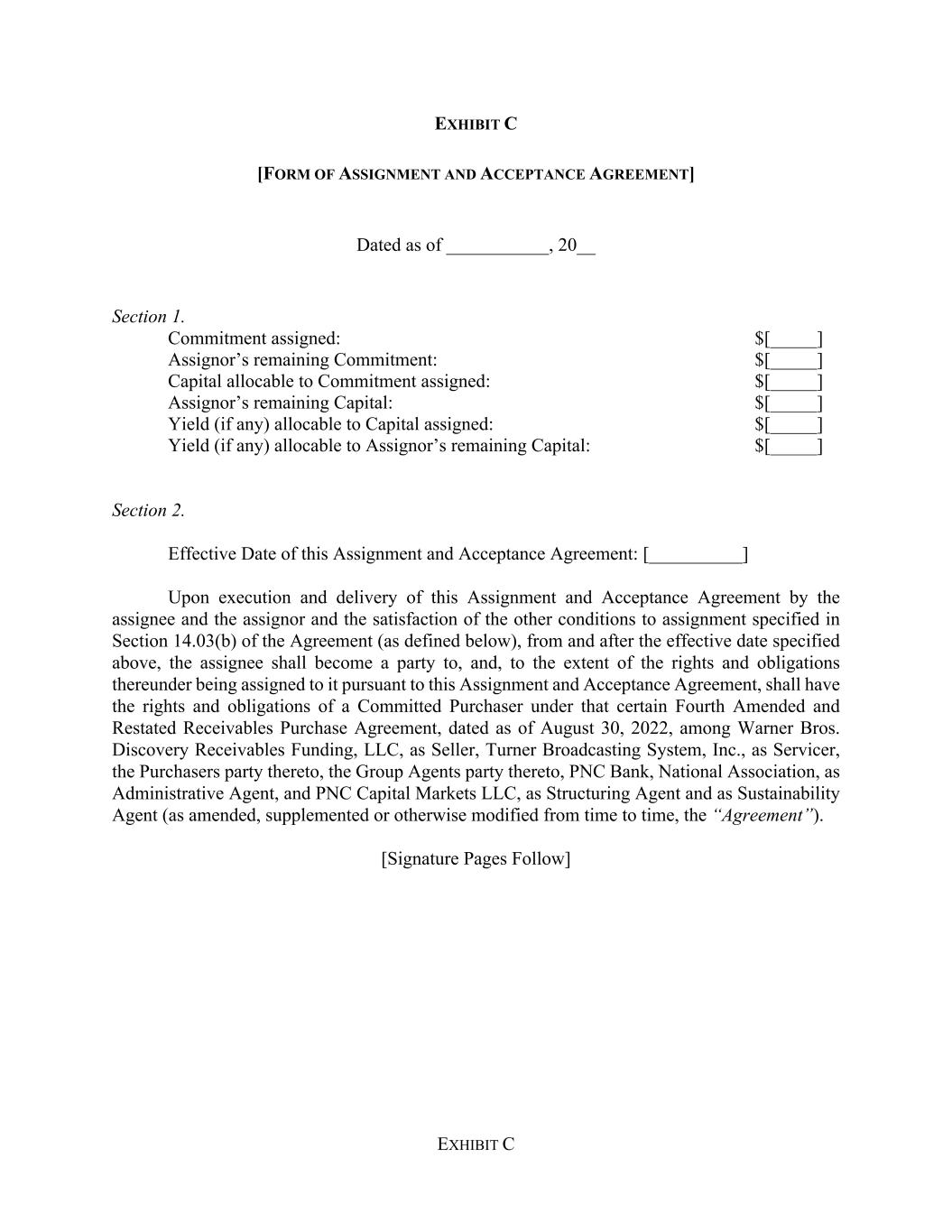 Exhibit C Exhibit C [转让和接受协议的形式]日期为__________,20 _ _ _第1节。转让的承诺:$ [ _____ ]转让人的剩余承诺:$ [ _____ ]可分配给转让的承诺的资本:$ [ _____ ]转让人的剩余资本:$ [ _____ ]可分配给转让的资本的收益率(如有):$ [ _____ ]可分配给转让人剩余资本的收益率(如有):$ [ _____ ]第2节。本转让和接受协议生效日期:[ __________ ]自受让人和转让人签署并交付本转让和接受协议并满足协议第14.03(b)节(定义见下文)规定的其他转让条件时起,自上述规定的生效日期及之后,受让人应成为该协议的当事人,并在根据本转让和接受协议转让给其的该协议项下的权利和义务范围内,根据日期为2022年8月30日的华纳兄弟Discovery Receivables Funding,LLC作为卖方、Turner Broadcasting System,Inc.作为服务商、其买方、集团代理方、PNC银行、National Association作为行政代理人、PNC Capital Markets LLC作为结构代理和可持续发展代理(经不时修订、补充或以其他方式修改,称为“协议”),应享有承诺的买方的权利和义务。[签名页关注]