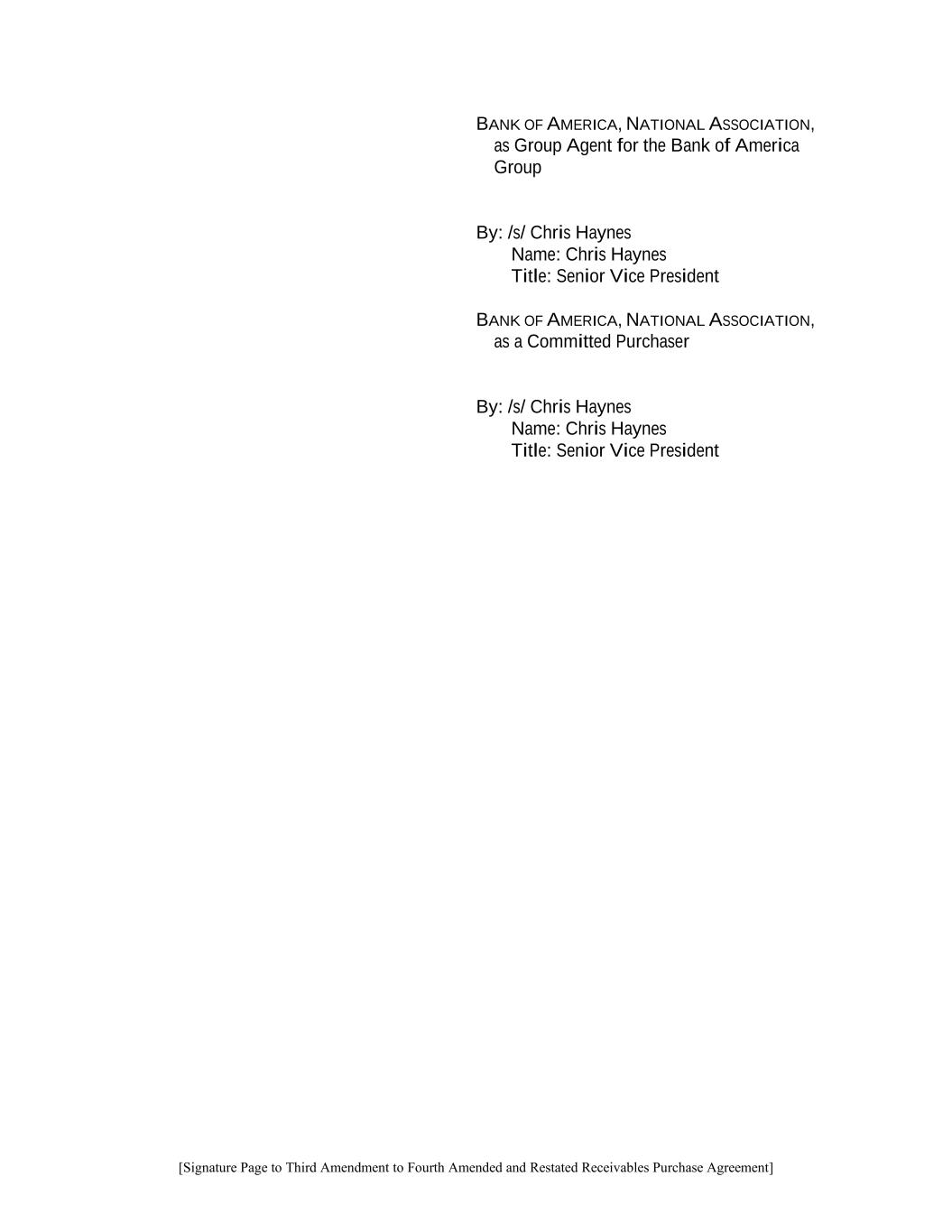 【第四次修订和重述的应收账款购买协议第三修正案签署页】美国银行,全国协会,作为美国银行集团的集团代理由:/s/Chris Haynes姓名:Chris Haynes职务:美国银行,全国协会高级副总裁,作为承诺购买者由:/s/Chris Haynes姓名:Chris Haynes职务:高级副总裁