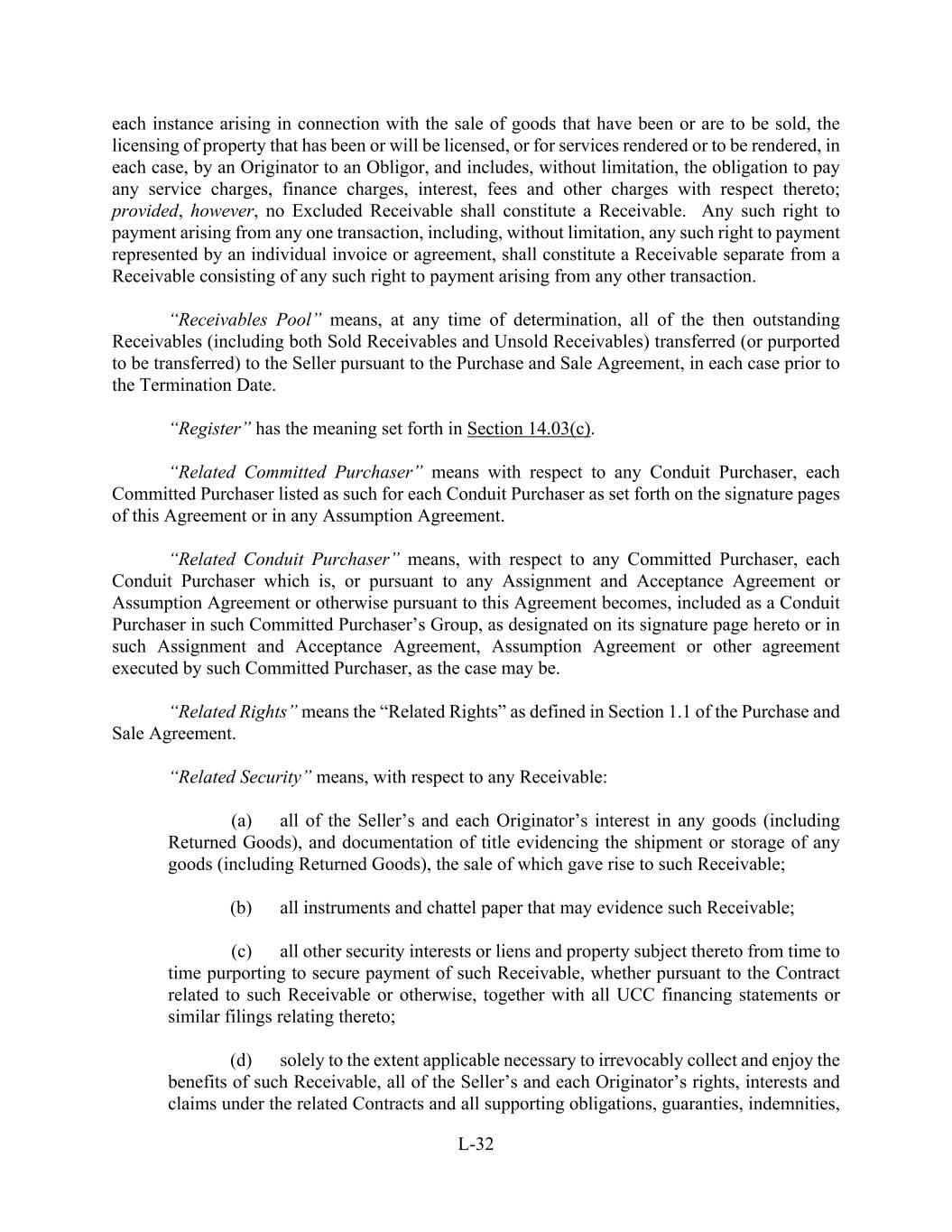 L-32在每种情况下,与已经或将要出售的货物的销售、已经或将要获得许可的财产的许可、或由发起人向债务人提供或将要提供的服务有关的每一种情况,并包括但不限于支付任何服务费用、财务费用、利息、费用和与此有关的其他费用的义务;但不排除的应收款项不应构成应收款项。由任何一笔交易产生的任何此类受付权,包括但不限于由单独的发票或协议所代表的任何此类受付权,应构成一种独立于由任何其他交易产生的任何此类受付权组成的应收款项的应收款项。“应收款池”是指,在任何确定时间,根据买卖协议转让(或声称转让)给卖方的所有当时未偿还的应收账款(包括已售出的应收账款和未售出的应收账款),在每种情况下均在终止日期之前。“注册”具有第14.03(c)节规定的含义。“相关承诺购买者”是指就任何管道购买者而言,本协议签署页或任何假设协议中规定的为每个管道购买者列出的每个承诺购买者。“相关管道买方”是指,就任何承诺买方而言,根据或根据任何转让和接受协议或假设协议或以其他方式根据本协议成为该承诺买方集团中的每一名管道买方,如其在本协议的签字页上或在该承诺买方签署的该转让和接受协议、假设协议或其他协议(视情况而定)中所指定。“相关权利”指《购销协议》第1.1节定义的“相关权利”。“相关担保”是指,就任何应收款而言:(a)卖方和每个发起人在任何货物(包括退回的货物)中的所有权益,以及证明任何货物(包括退回的货物)的装运或储存的所有权文件,其销售产生了此类应收款;(b)可能证明此类应收款的所有票据和动产票据;(c)所有其他担保权益或留置权以及不时受其约束的财产,无论是根据与此类应收款相关的合同还是其他方式,连同所有与之相关的UCC融资报表或类似备案;(d)仅在不可撤销地收取和享有该等应收款项的利益所需的适用范围内,卖方和每个发起人在相关合同下的所有权利、利益和债权以及所有支持性义务、担保、赔偿,