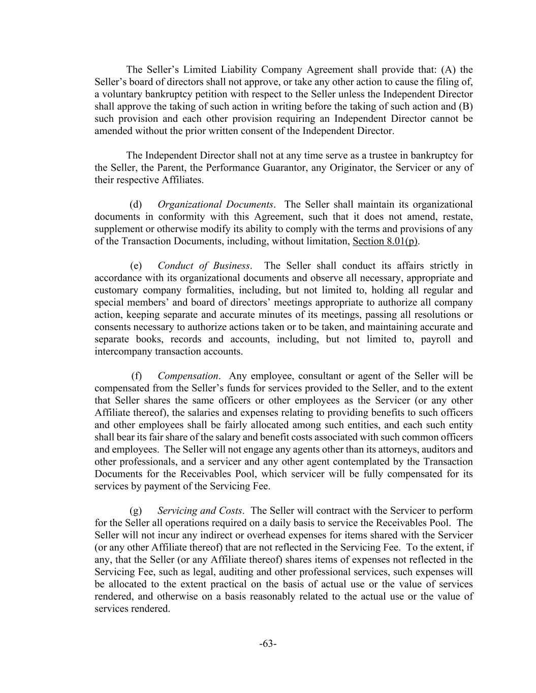 -63-卖方有限责任公司协议应规定:(a)卖方董事会不得批准或采取任何其他行动促使提交与卖方有关的自愿破产申请,除非独立董事应在采取此类行动之前以书面形式批准采取此类行动,并且(b)此类规定和要求独立董事的相互规定未经独立董事事先书面同意不得修改。独立董事不得在任何时候为卖方、母公司、履约保证人、任何发起人、服务商或其各自的任何关联公司担任破产受托人。(d)组织文件。卖方应按照本协议维护其组织文件,使其不修改、重述、补充或以其他方式修改其遵守任何交易文件的条款和规定的能力,包括但不限于第8.01(p)节。(e)经营行为。卖方应严格按照其组织文件处理其事务,并遵守所有必要、适当和惯常的公司手续,包括但不限于召开所有定期和特别成员及董事会会议,以适当授权所有公司行动,保存单独和准确的会议记录,通过所有必要的决议或同意,以授权已采取或将采取的行动,并保持准确和单独的账簿、记录和账户,包括但不限于工资单和公司间交易账户。(f)赔偿。卖方的任何雇员、顾问或代理人将从卖方向卖方提供服务的资金中获得补偿,并且在卖方与服务商(或其任何其他关联公司)共享相同的高级职员或其他雇员的情况下,与向这些高级职员和其他雇员提供福利有关的工资和费用应在这些实体之间公平分配,每个此类实体应承担与这些普通职员和雇员相关的工资和福利成本的公平份额。卖方将不会聘用除其律师、审计师和其他专业人员以外的任何代理人,以及一名服务商和交易文件所设想的应收账款池的任何其他代理人,该服务商将通过支付服务费获得其服务的全部补偿。(g)服务和费用。卖方将与服务商签订合同,为卖方执行每日为应收账款池提供服务所需的所有操作。卖方不会因与服务商(或其任何其他关联公司)共享的未反映在服务费中的项目而产生任何间接或间接费用。在卖方(或其任何关联机构)分担服务费中未反映的费用项目(如有)的情况下,如法律、审计和其他专业服务,这些费用将根据实际使用情况或所提供服务的价值在切实可行的范围内分配,否则将根据与实际使用情况或所提供服务的价值合理相关的基础进行分配。