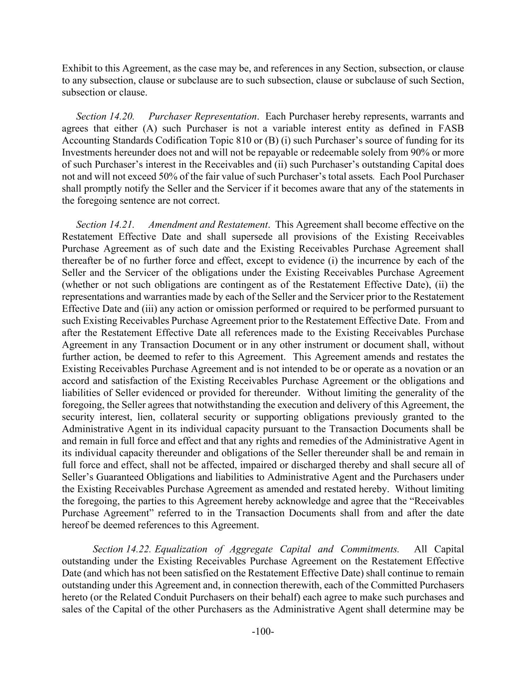 -100-附件本协议(视属何情况而定),而在任何条文、分节或条款中提述任何分节、条款或分节,均指该等条文、分节或条款的分节、条款或分节。第14.20节。买方代表。各买方在此声明、保证并同意,(a)该买方不是FASB会计准则编纂主题810中定义的可变利益实体,或(b)(i)该买方根据本协议进行投资的资金来源不会也不会仅从该买方在应收款中的90%或更多权益中偿还或赎回,以及(ii)该买方的未偿资本不会也不会超过该买方总资产公允价值的50%。每一池买方如知悉前述句子中的任何陈述不正确,应及时通知卖方和服务商。第14.21节。修正和重述。本协议应于重述生效日期生效,并应取代自该日期起现有应收款购买协议的所有条款,且现有应收款购买协议此后不再具有效力和效力,除非有证据证明(i)卖方和服务商各自承担了现有应收款购买协议项下的义务(无论这些义务在重述生效日期是否或有的),(ii)卖方及服务商各自在重述生效日期前作出的陈述及保证,及(iii)在重述生效日期前依据该等现有应收款购买协议而作出或须作出的任何作为或不作为。自重述生效日期起及之后,任何交易文件或任何其他文书或文件中对现有应收款购买协议的所有提及,均应视为提及本协议,而无需采取进一步行动。本协议对现有应收款购买协议进行修订和重述,并不旨在或作为现有应收款购买协议或根据该协议证明或规定的卖方义务和责任的更新或协议和满足而运作。在不限制前述一般性的情况下,卖方同意,尽管本协议已执行和交付,但先前依据交易文件以个人身份授予行政代理人的担保权益、留置权、抵押担保或支持义务应并将继续完全有效和有效,行政代理人以个人身份在本协议项下的任何权利和补救措施以及卖方在本协议项下的义务应且将继续完全有效和不受影响,因此受损或解除,并应确保卖方根据特此修订和重述的现有应收款购买协议向行政代理人和买方承担的所有担保义务和责任。在不限制前述内容的情况下,本协议各方在此承认并同意,交易文件中所指的“应收款购买协议”自本协议之日起及之后均视为本协议的提述。第14.22节。总资本和承诺的均等化。在重述生效日期(且在重述生效日期尚未清偿)现有应收款购买协议项下的所有未清偿资本应继续在本协议项下保持未清偿状态,并且与此相关,本协议的每一承诺买方(或代表其的相关管道买方)各自同意对行政代理人可能确定的其他买方的资本进行购买和出售
