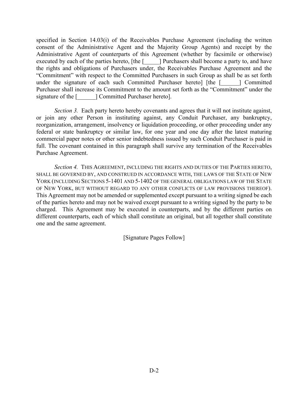 应收款采购协议第14.03(i)节规定的D-2(包括行政代理人和多数群体代理人的书面同意)和本协议对应方的行政代理人签收(无论是通过传真还是其他方式),[ [ _____ ]买方应成为买方的一方,并拥有买方根据,应收款项采购协议和与本协议各承诺采购人签署下所述集团内承诺采购人有关的“承诺”] [ [ ______ ]承诺采购人应将其承诺增加至本协议[ ______ ]承诺采购人签署下所述“承诺”的金额]。第3节。本协议各方在此承诺并同意,在该管道买方发行的最近到期商业票据或其他优先债务全额偿付后的一年零一天内,其将不对任何管道买方提起诉讼,或与任何其他人一起对任何管道买方提起诉讼、任何破产、重组、安排、破产或清算程序,或任何联邦或州破产法或类似法律下的其他程序。本款所载的契诺在应收款购买协议的任何终止后仍然有效。第4节。本协议,包括本协议各方的权利和义务,应由纽约州法律(包括纽约州一般义务法第5-1401和5-1402条,但不考虑其中任何其他法律条款的冲突)管辖并根据其进行构建。本协议不得修改或补充,除非根据签署的书面为本协议的每一方,并且不得放弃,除非根据签署的书面由被收费方。本协议可以在对应方执行,由不同的当事人对不同的对应方执行,每一方应构成正本,但共同构成一份相同的协议。[签名页关注]