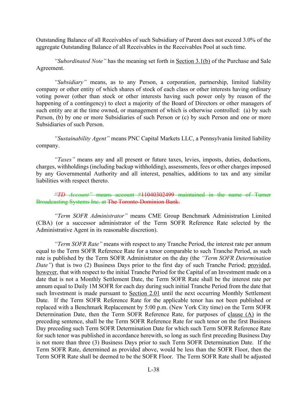 L-38母公司该子公司所有应收款的未偿余额不超过该时点应收款池所有应收款未偿余额合计的3.0%。「次级票据」的涵义载于买卖协议第3.1(b)条。“附属”是指,就任何人而言,公司、合伙企业、有限责任公司或其他实体,其每个类别的股票或其他具有普通投票权的权益(仅因意外事件的发生而具有此类权力的股票或其他权益除外)在当时拥有或以其他方式控制该实体的董事会或其他经理的多数席位,或其管理层:(a)由该人,(b)由该人的一个或多个附属公司或(c)由该人及该人的一个或多个附属公司作出。“Sustainability Agent”是指PNC Capital Markets LLC,一家宾夕法尼亚州的有限责任公司。“税”是指任何政府当局施加的任何和所有当前或未来的税收、征税、关税、扣除、收费、预扣(包括备用预扣)、评估、费用或其他收费,以及与此相关的所有利息、罚款、税收增加和任何类似的责任。“TD账户”是指在多伦多道明银行以Turner Broadcasting Systems Inc.名义维护的账户# 11040302499。“任期SOFR管理人”是指芝加哥商品交易所 BenchMark Administration Limited(CBA)(或由行政代理人合理酌情选择的任期SOFR参考利率的继任管理人)。“定期SOFR利率”是指就任何分档期而言,相当于与该分档期相当的期限的定期SOFR参考利率的年利率,因为该利率由定期SOFR管理人在该分档期第一天之前的两(2)个工作日当天(“定期SOFR确定日期”)公布;但条件是,就在非月度结算日作出的投资的资本的初始分档期而言,定期SOFR利率应为自根据第2.01节进行此类投资之日起至下一个发生的每月结算日期的该初始档期间内每一天的年利率等于每日1M SOFR。如果在SOFR期限确定日下午5:00(纽约市时间)之前,适用期限的SOFR参考利率尚未公布或被基准替换,则就上一句中的(a)款而言,SOFR期限参考利率应为根据本协议公布该期限SOFR期限参考利率的该期限SOFR期限确定日前第一个工作日的该期限SOFR期限参考利率,只要该前一个营业日不超过该期限SOFR确定日期前三(3)个营业日。如果按上述规定确定的期限SOFR率将低于SOFR下限,则期限SOFR率应被视为SOFR下限。期限SOFR费率调整