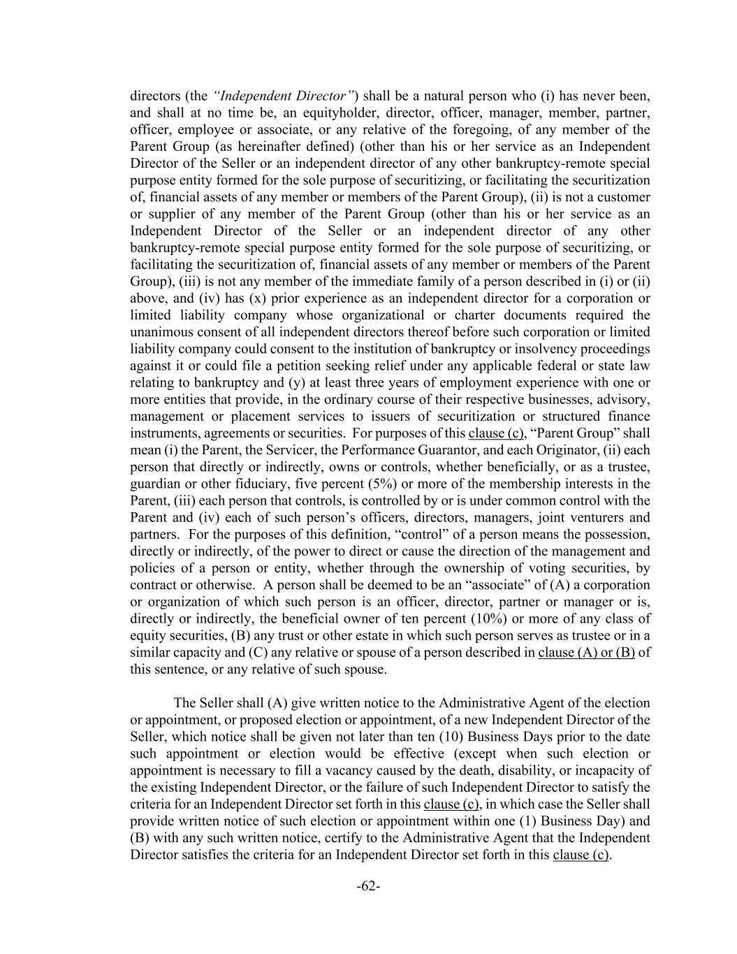 -62-董事(“独立董事”)应为自然人,该自然人(i)从未且在任何时候都不应是母公司集团(定义见下文)任何成员的股东、董事、高级管理人员、经理、成员、合伙人、高级管理人员、雇员或联营公司,或上述任何亲属(但其担任卖方的独立董事或仅为将母公司集团任何成员或成员的金融资产证券化或促进其证券化而成立的任何其他破产-远程特殊目的实体的独立董事除外),(ii)并非母公司集团任何成员的客户或供应商(他或她担任卖方的独立董事或任何其他仅为将母公司集团任何成员或成员的金融资产证券化或促进证券化而成立的破产-远程特殊目的实体的独立董事除外),(iii)并非上述(i)或(ii)所述的人的直系亲属的任何成员,(iv)有(x)曾在组织或章程文件要求其所有独立董事一致同意的公司或有限责任公司担任独立董事的经验,然后该公司或有限责任公司才能同意对其提起破产或破产程序,或可根据与破产有关的任何适用的联邦或州法律提交申请寻求救济,以及(y)在一个或多个在其各自业务的正常过程中提供咨询的实体至少三年的就业经验,为证券化或结构性融资工具、协议或证券的发行人提供管理或配售服务。就本(c)条而言,“母公司集团”是指(i)母公司、服务商、履约担保人和每个发起人,(ii)直接或间接、拥有或控制(无论是实益的)或作为受托人、监护人或其他受托人的每个人,在母公司的成员权益的百分之五(5%)或更多,(iii)控制、受母公司控制或与母公司共同控制的每个人,以及(iv)这些人的高级职员、董事、经理、合营者和合伙人。就本定义而言,“控制”一个人是指直接或间接拥有权力,以指导或导致一个人或实体的管理和政策的方向,无论是通过对有表决权的证券的所有权,还是通过合同或其他方式。任何人须被视为(a)该人为高级人员、董事、合伙人或经理的法团或组织的“联系人”,或直接或间接为任何类别股本证券百分之十(10%)或以上的实益拥有人,(b)该人担任受托人或以类似身份的任何信托或其他产业,及(c)本句(a)或(b)条所述的人的任何亲属或配偶,或该配偶的任何亲属。卖方应(a)向行政代理人发出选举或委任、或提议的选举或委任卖方新独立董事的书面通知,该通知应不迟于该任命或选举生效之日前十(10)个工作日发出(除非该选举或委任是为填补因现有独立董事死亡、伤残或无行为能力,或该独立董事未能满足本(c)条规定的独立董事标准而导致的空缺所必需的,在这种情况下,卖方应在一(1)个工作日内提供有关此类选举或任命的书面通知),并(b)连同任何此类书面通知,向行政代理人证明独立董事满足本(c)条规定的独立董事标准。
