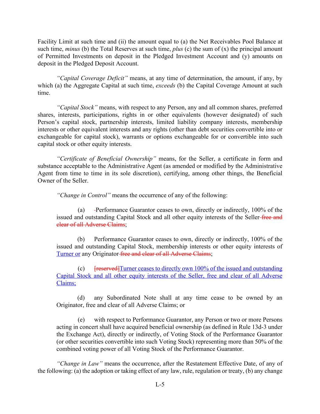 当时的L-5融资限额和(ii)等于(a)当时的应收账款净池余额,减去(b)当时的准备金总额,加上(c)(x)存入质押投资账户的允许投资本金和(y)存入质押存款账户的金额之和。“资本覆盖赤字”是指,在任何确定时间,(a)当时的总资本超过(b)当时的资本覆盖金额的金额(如有)。“股本”是指,就任何人而言,该人的股本、合伙权益、有限责任公司权益、会员权益或其他同等权益以及任何权利(可转换为或可交换为股本的债务证券除外)、可交换或可转换为该股本或其他股本权益的认股权证或期权的任何和所有普通股、优先股、权益、参与、权利或其他等价物(无论是否指定)。“受益所有权证书”对卖方而言是指行政代理人可接受的形式和实质内容的证书(经行政代理人不时酌情修改或修改),其中包括证明卖方的受益所有人。“控制权变更”是指发生以下任一情形:(a)履约担保人不再直接或间接拥有卖方100%已发行及未偿还股本及所有其他股本权益,且不存在任何不利债权;(b)履约担保人不再直接或间接拥有已发行及未偿还股本的100%,Turner或任何发起人的会员权益或其他股权,不存在任何不利债权;(c)[保留] Turner不再直接拥有卖方100%的已发行和流通股本和所有其他股权,不存在任何不利债权;(d)任何次级票据应在任何时候不再由发起人拥有,不存在任何不利债权;或(e)就履约担保人而言,任何个人或两个或两个以上一致行动人应已直接或间接获得履约担保人有表决权股份(或其他可转换为该等有表决权股份的证券)的实益所有权(定义见《交易法》第13d-3条),代表履约担保人所有有表决权股份的合并投票权的50%以上。“法律变更”是指在重述生效日期后发生以下任何情况:(a)任何法律、规则、条例或条约的通过或生效,(b)任何变更
