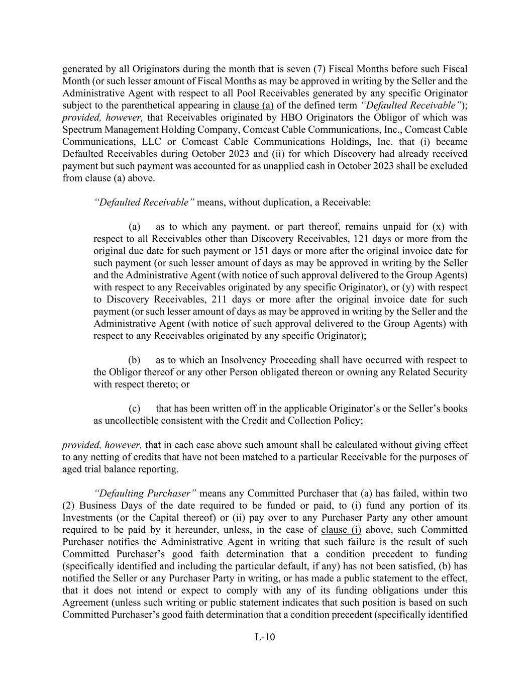 所有发起人在该财政月之前的七(7)个财政月(或卖方和行政代理人可能就任何特定发起人产生的所有集合应收账款书面批准的较少金额的财政月)内产生的L-10,但前提是HBO发起人发起的应收账款,其义务人是Spectrum Management Holding Company、康卡斯特 Cable Communications,Inc.、康卡斯特 Cable Communications,LLC或康卡斯特 Cable Communications Holdings,Inc.将(i)在2023年10月期间成为违约应收账款和(ii)Discovery已收到付款但该付款在2023年10月作为未应用现金入账的情况排除在上述(a)条之外。“违约应收款”是指(不重复)应收款项:(a)就Discovery应收款以外的所有应收款而言,(x)的任何付款或部分仍未支付,自该付款的原始到期日起121天或更长时间,或自该付款的原始发票日期后151天或更长时间(或卖方和行政代理人(连同就任何特定发起人产生的任何应收款向集团代理人送达的此类批准通知)可能书面批准的较短天数),或(y)关于Discovery应收款,在原始发票日期后211天或更长时间内,就任何特定发起人产生的任何应收款(或卖方和行政代理人书面批准的较短天数(连同已向集团代理人交付的此类批准通知));(b)就其债务人或对其承担义务或拥有与其相关的任何相关担保的任何其他人而言,应已发生破产程序;或(c)根据信用和收款政策,在适用的发起人或卖方账簿中被注销为无法收回的;但条件是,在每种情况下,高于该金额的金额应在计算时不对未为账龄试算表报告目的与特定应收款项相匹配的任何信用进行净额结算。“违约买方”是指(a)未能在要求提供资金或付款之日起两(2)个营业日内(i)为其投资的任何部分(或其资本)提供资金或(ii)向任何买方支付其根据本协议要求支付的任何其他金额的任何承诺买方,除非在上述第(i)款的情况下,该承诺买方书面通知行政代理人,此种失败是该承诺买方善意确定提供资金的先决条件(具体确定并包括特定违约,(如有的话)尚未信纳,(b)已书面通知卖方或任何买方一方,或已作出大意为其不打算或预期遵守其在本协议下的任何筹资义务的公开声明(除非该书面或公开声明表明该立场是基于该承诺买方的善意认定,即一项先决条件(具体指