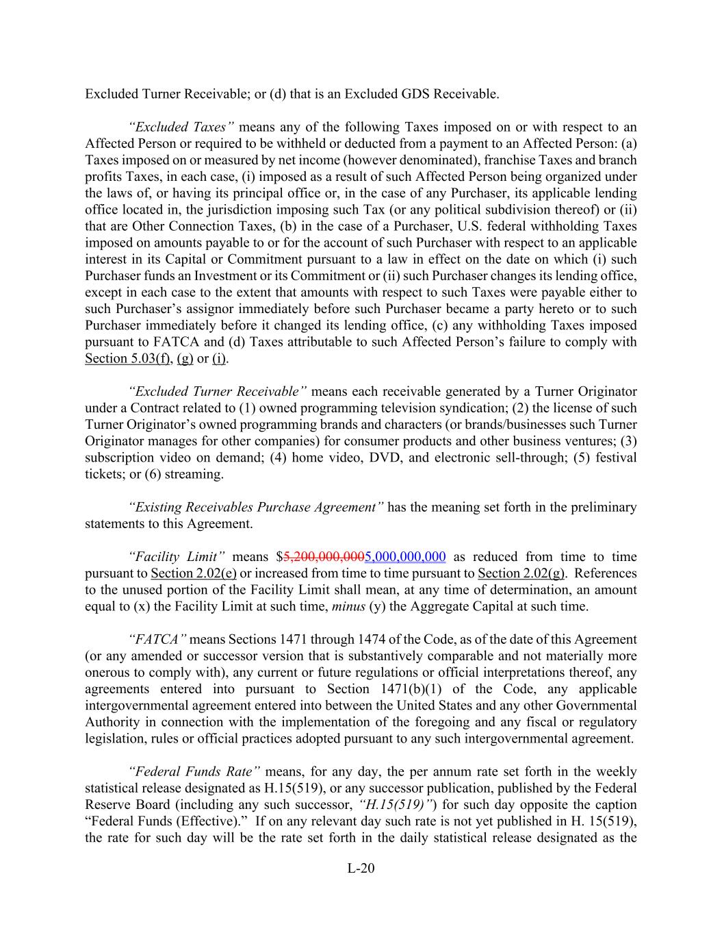 L-20不包括特纳应收账款;或(d)为不包括的GDS应收账款。“排除税项”是指对受影响人士征收或就受影响人士征收或须从向受影响人士支付的款项中扣留或扣除的下列任何税项:(a)对净收入(无论如何计价)征收或计量的税项、特许经营税和分支机构利得税,在每种情况下,(i)由于该受影响人士根据法律成立,或其主要办事处或(就任何买方而言)其适用的贷款办事处位于,征收此类税款(或其任何政治细分)或(ii)属于其他关连税的司法管辖区,(b)就买方而言,根据在(i)该买方为一项投资或其承诺提供资金或(ii)该买方更换其贷款办事处之日生效的法律,就其资本或承诺中的适用权益应付给该买方或为其账户支付的金额征收的美国联邦预扣税,除非在每种情况下,与此类税款有关的款项应在该买方成为本协议的一方之前立即支付给该买方的转让人,或在该买方更换其贷款办事处之前立即支付给该买方,(c)根据FATCA征收的任何预扣税,以及(d)由于该受影响的人未能遵守第5.03(f)、(g)或(i)节而应缴纳的税款。“Excluded Turner Receivable”是指Turner Originator根据与(1)自有节目电视联合组织相关的合同产生的每笔应收款;(2)此类Turner Originator自有节目品牌和角色(或Turner Originator为其他公司管理的品牌/业务)的许可,用于消费产品和其他商业企业;(3)订阅视频点播;(4)家庭视频、DVD和电子销售;(5)节日门票;或(6)流媒体。“现有应收账款购买协议”具有本协议初步声明中规定的含义。“融资限额”是指根据第2.02(e)节不时减少或根据第2.02(g)节不时增加的5,200,000,0005,000,000,000,000,000,000,000,000,000,000,000,000,000,000,000,000,000,000,000,000,000,000,000,000,000,000,000,000,000,000,000,000,000,000,000,000,000,000,000,000,000对融资限额未使用部分的提及,在确定的任何时候,应指等于(x)当时融资限额减去(y)当时总资本的金额。“FATCA”是指《守则》第1471至1474条,截至本协议之日(或任何实质上具有可比性且遵守起来并无实质性更繁重的修订或后续版本),任何现行或未来的法规或其官方解释,根据《守则》第1471(b)(1)条订立的任何协议,美国与任何其他政府当局就实施上述规定订立的任何适用的政府间协议,以及根据任何此类政府间协议通过的任何财政或监管立法、规则或官方做法。“联邦基金利率”是指,在任何一天,由美国联邦储备委员会(Fed Reserve Board)(包括任何此类继任者,“H.15(519)”)发布的指定为H.15(519)的每周统计发布中规定的年利率,该日期与标题“联邦基金(有效)”相对。如在任何有关日期该等费率尚未在H.15(519)中公布,则该日期的费率将为每日统计发布中规定的费率,指定为
