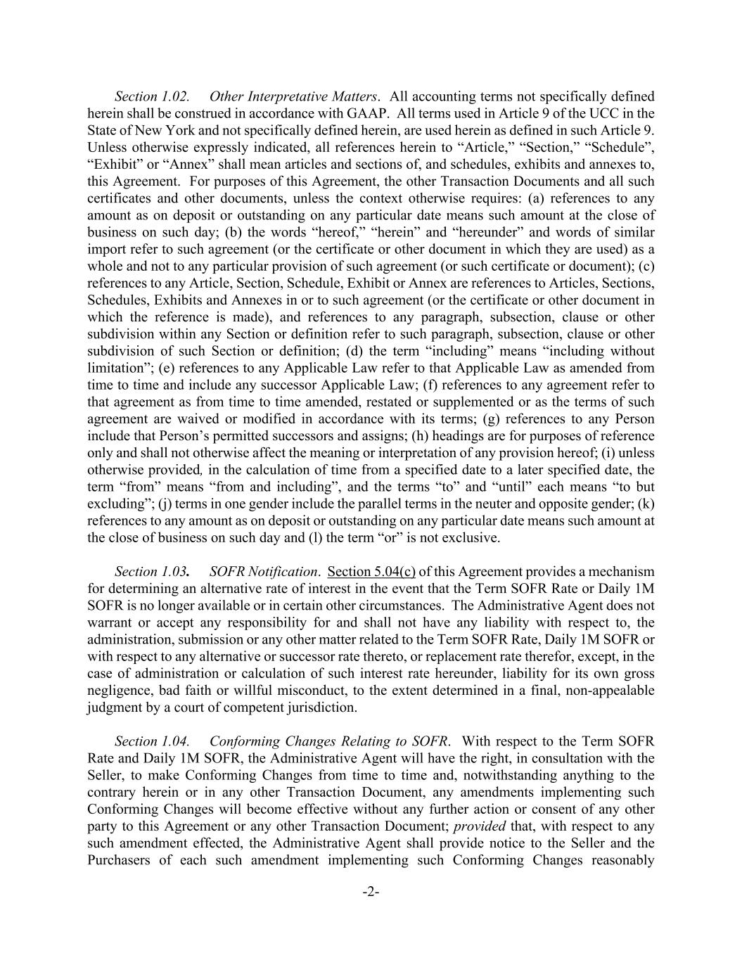 -2-第1.02节。其他解释性事项。此处未具体定义的所有会计术语应按照GAAP进行解释。纽约州的UCC第9条中使用的所有术语,且在此未作具体定义的,均按此类第9条中的定义在此使用。除非另有明确说明,本文中所有提及的“条款”、“部分”、“附表”、“附件”或“附件”均系指本协议的条款和部分,以及本协议的附表、附件和附件。就本协议而言,其他交易文件以及所有此类证书和其他文件,除非上下文另有要求:(a)提及任何特定日期的存款或未偿还金额是指在该日期营业结束时的该金额;(b)“本协议”等字样,“herein”和“hereunder”以及类似含义的词语是指该协议(或其所使用的证书或其他文件)作为一个整体,而不是指该协议(或该证书或文件)的任何特定条款;(c)对任何条款、章节、附表、附件或附件的提及是指该协议中或该协议中的条款、章节、附表、附件和附件(或进行提及的证书或其他文件),对任何章节或定义中的任何段落、分节、条款或其他细分的提及是指该段落、分节,该条文或定义的条款或其他细分;(d)“包括”一词是指“包括但不限于”;(e)对任何适用法律的提述是指该适用法律经不时修订,并包括任何后续适用法律;(f)对任何协议的提述是指该协议经不时修订,重述或补充,或随着该协议的条款根据其条款被放弃或修改;(g)对任何人的提述包括该人的许可继承人和受让人;(h)标题仅供参考,不得以其他方式影响本协议任何条款的含义或解释;(i)除非另有规定,在计算从指定日期到较后指定日期的时间时,“从”一词是指“从并包括”,而术语“to”和“until”各表示“to but exclude”;(j)一个性别的术语包括中性和异性中的平行术语;(k)提及任何特定日期的存款或未偿还金额是指该日期营业结束时的该金额,并且(l)“或”一词不是排他性的。第1.03节。SOFR通知。本协议第5.04(c)节规定了在定期SOFR利率或每日1M SOFR不再可用或在某些其他情况下确定替代利率的机制。行政代理人对定期SOFR利率、每日1M SOFR或与其任何替代或后续利率或其替代利率相关的任何其他事项不保证或接受任何责任,也不承担任何责任,除非在管理或计算本协议项下该利率的情况下,对其自身的重大过失、恶意或故意不当行为承担责任,但以有管辖权的法院最终不可上诉的判决确定的范围为限。第1.04节。与SOFR相关的一致变化。关于期限SOFR费率和每日1M SOFR,行政代理人将有权与卖方协商,不时作出一致的变更,尽管本协议或任何其他交易文件中有任何相反的规定,但实施此类一致变更的任何修订将生效,而无需本协议或任何其他交易文件的任何其他方采取任何进一步行动或同意;但就所实施的任何此类修订而言,行政代理人应当向卖方和买方提供每一次合理实施该等符合性变更的该等修改的通知