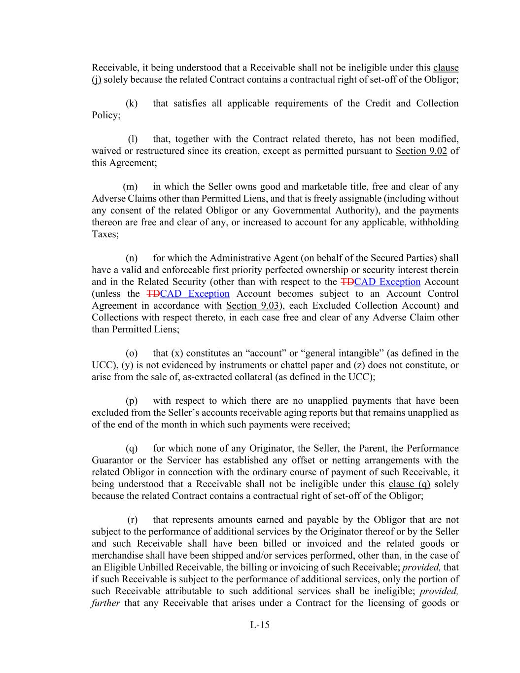L-15应收款,据了解,应收款不应仅因相关合同包含债务人的合同抵销权而不符合本条款规定的资格;(k)满足信贷和收款政策的所有适用要求;(l)连同与之相关的合同自其创建以来未被修改、放弃或重组,除非根据本协议第9.02节允许;(m)卖方拥有良好且可销售的所有权,不存在除允许的留置权之外的任何不利债权,且可自由转让(包括未经相关义务人或任何政府当局的任何同意),且就其支付的款项免于任何或增加以计入任何适用的预扣税;(n)行政代理人(代表有担保当事人)对其拥有有效和可执行的第一优先权的完善的所有权或担保权益以及相关证券(不包括与TDCAD例外账户相关的所有权或担保权益(除非TDCAD例外账户根据第9.03节成为账户控制协议的约束),每个被排除在外的托收账户)及其相关的托收,在每种情况下均免于且不存在除许可留置权之外的任何不利债权;(o)(x)构成“账户”或“一般无形资产”(定义见UCC),(y)没有票据或动产票据作为证据,以及(z)不构成或产生于出售,提取后的抵押品(定义见UCC);(p)对于这些款项,不存在未被排除在卖方应收账款账龄报告之外但截至收到该等款项的当月末仍未被应用的未应用的款项;(q)任何发起人、卖方、母公司、履约担保人或服务商均未就该等应收款项的正常支付过程与相关债务人建立任何抵销或净额结算安排,据了解,应收款项不得仅因相关合同包含债务人的合同抵销权而不符合本条款(q)项下的资格;(r)表示债务人赚取和应付的金额,但不受其发起人或卖方提供额外服务的约束,且该应收款项应已开票或开具发票,相关货物或商品应已发运和/或提供服务,但在符合条件的未开票应收款的情况下,该应收款项的开票或开具发票除外;但,如该等应收款项须受附加服务的履行所规限,则只有该等应收款项中归属于该等附加服务的部分不符合资格;但进一步规定,根据货物许可合同产生的任何应收款项或