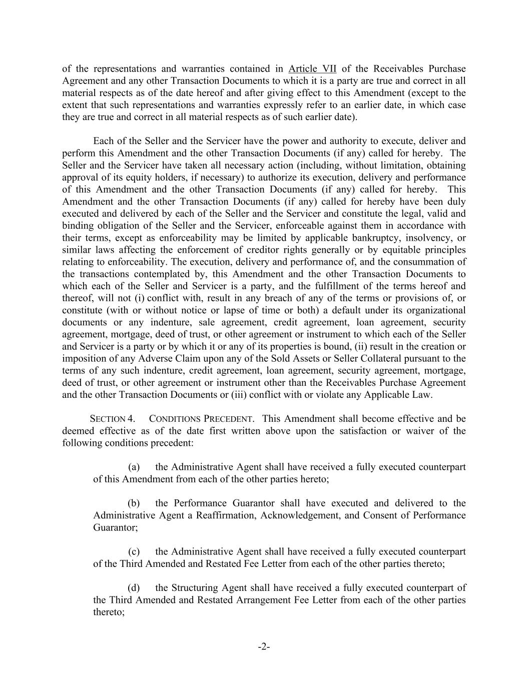 -2-应收账款购买协议第七条所载的陈述和保证及其作为一方的任何其他交易文件中所载的陈述和保证在本协议日期和本修订生效后在所有重大方面都是真实和正确的(除非此类陈述和保证明确提及较早的日期,在这种情况下,它们在截至该较早日期的所有重大方面都是真实和正确的)。卖方和服务商各自拥有执行、交付和履行本修订和特此要求的其他交易文件(如有)的权力和权力。卖方和服务商已采取一切必要行动(包括但不限于在必要时获得其权益持有人的批准),以授权其执行、交付和履行本修订和特此要求的其他交易文件(如有)。本修正案和特此要求的其他交易文件(如有)已由卖方和服务商各自正式签署和交付,构成卖方和服务商的法律、有效和具有约束力的义务,可根据其条款对其强制执行,但可执行性可能受到适用的破产、破产或影响债权人权利强制执行的类似法律的限制,或受到与可执行性相关的衡平法原则的限制。本修正案以及卖方和服务商各自为一方当事人的其他交易文件的执行、交付和履行以及所设想的交易的完成,以及本协议及其条款的履行,不会(i)与其组织文件或任何契约、销售协议、信贷协议、贷款协议、担保协议、抵押、信托契据项下的违约,导致任何条款或条款的任何违反,或构成(无论是否有通知或时间流逝,或两者兼而有之)违约,或卖方和服务商各自为一方当事人或其或其任何财产受其约束的其他协议或文书,(ii)根据任何此类契约、信贷协议、贷款协议、担保协议、抵押、信托契据或应收款购买协议和其他交易文件以外的其他协议或文书的条款,导致对任何出售资产或卖方抵押品产生或施加任何不利债权,或(iii)与任何适用法律相冲突或违反。第4节。先决条件。本修正案自满足或放弃下列先决条件之日起生效并自上述首次写入之日起视为生效:(a)行政代理人应当已收到本修正案其他各方当事人出具的完全执行的对应方;(b)履约保证人应当已签署并向行政代理人交付了一份重申、确认书,及履约保证人同意;(c)行政代理人应已收到其他每一方当事人出具的第三次修订重述费用函的完全执行对应方;(d)构筑方代理人应已收到其他每一方当事人出具的第三次修订重述安排费用函的完全执行对应方;