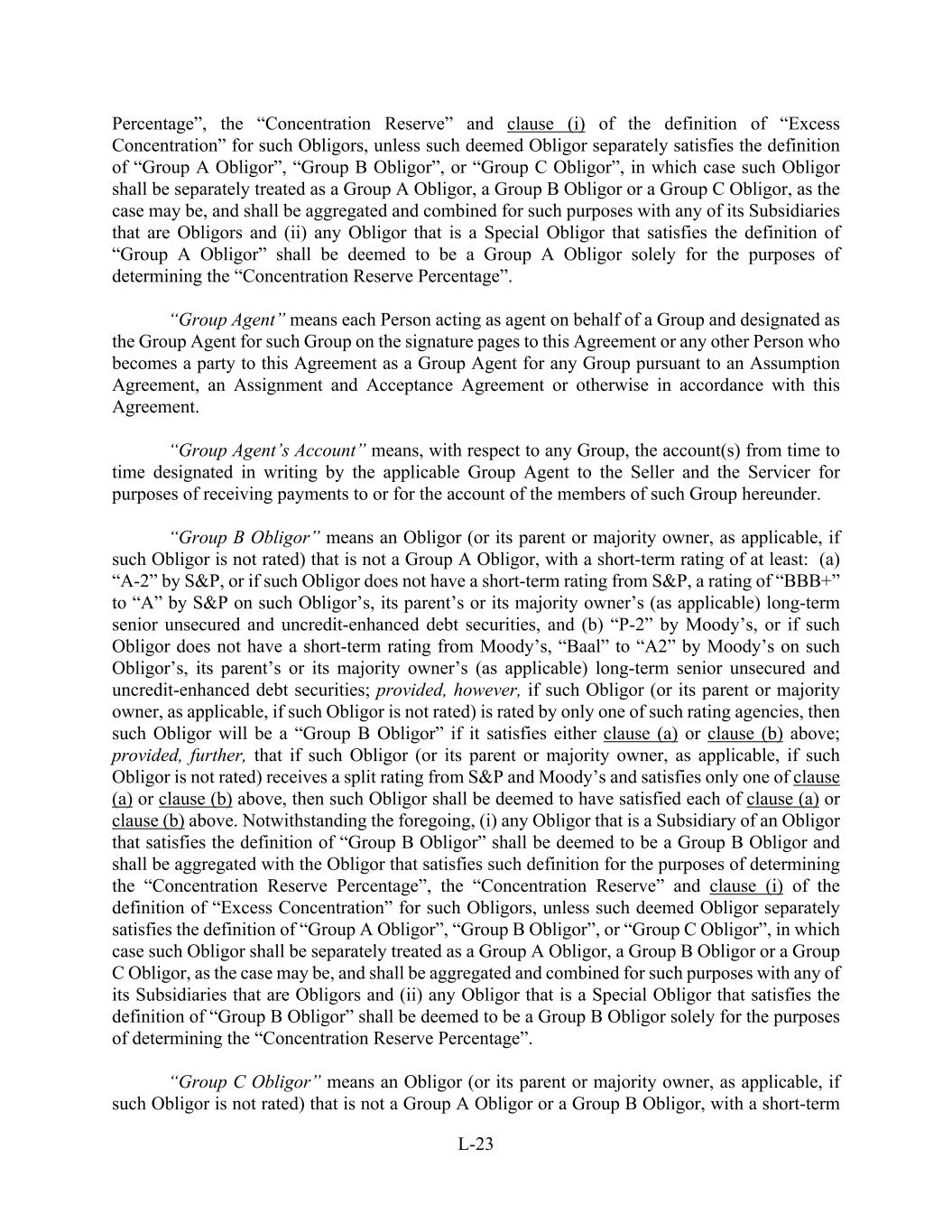 L-23 %”、“集中储备金”以及对该等义务人的“超额集中”定义(i)项,除非该被视为义务人分别满足“A组义务人”、“B组义务人”或“C组义务人”的定义,在此情况下,该义务人应分别作为A组义务人、B组义务人或C组义务人(视情况而定)处理,并应为此目的与其作为义务人的任何子公司进行汇总和合并,以及(ii)任何作为特别义务人且满足“A组义务人”定义的义务人应仅为确定“集中储备百分比”的目的被视为A组义务人。“集团代理人”是指根据假设协议、转让和接受协议或根据本协议以其他方式成为本协议一方的任何集团的集团代理人并在本协议签署页上指定为该集团的集团代理人的每一人或成为本协议一方的任何其他人。“集团代理账户”就任何集团而言,是指由适用的集团代理不时以书面指定给卖方和服务商的账户,用于根据本协议向该集团的成员收取款项或为其账户收取款项。“B组义务人”是指非A组义务人的义务人(或其母公司或大股东,如该义务人未获评级),短期评级至少为:(a)标普“A-2”,或者如果该义务人未获得标普的短期评级,则标普对该义务人、其母公司或其大股东(如适用)的长期优先无担保和无信用增强债务证券的“BBB +”至“A”评级,以及(b)穆迪“P-2”,或者如果该义务人未获得穆迪的短期评级,穆迪就该等债务人、其母公司或其大股东(如适用)的长期优先无担保和无信用增强型债务证券作出“Baal”至“A2”评级;但前提是,如果该债务人(或其母公司或大股东,如适用,该债务人未获评级)仅由该等评级机构中的一家进行评级,则该债务人在满足上述(a)或(b)条款中任何一项的情况下将成为“B组债务人”;此外,前提是,如果该债务人(或其母公司或大股东,如适用,如果该债务人未获评级)获得标普和穆迪的拆分评级,并且仅满足上述(a)条或(b)条中的一项,则该债务人应被视为已满足上述(a)条或(b)条中的每一项。尽管有上述规定,(i)作为满足“B组义务人”定义的义务人的附属公司的任何义务人,应被视为B组义务人,并应与满足该定义的义务人合并,以确定该等义务人的“集中储备百分比”、“集中储备”和“超额集中”定义的(i)条,除非该被视为义务人分别满足“A组义务人”、“B组义务人”或“C组义务人”的定义,在此情况下,该义务人应被单独视为A组义务人,a B组义务人或C组义务人(视情况而定),并应为此目的与其作为义务人的任何子公司进行汇总和合并,以及(ii)任何作为满足“B组义务人”定义的特别义务人的义务人,仅为确定“集中储备百分比”的目的,应被视为B组义务人。“C组义务人”是指非A组义务人或B组义务人的义务人(或其母公司或大股东,如适用,该义务人未获评级),具有短期