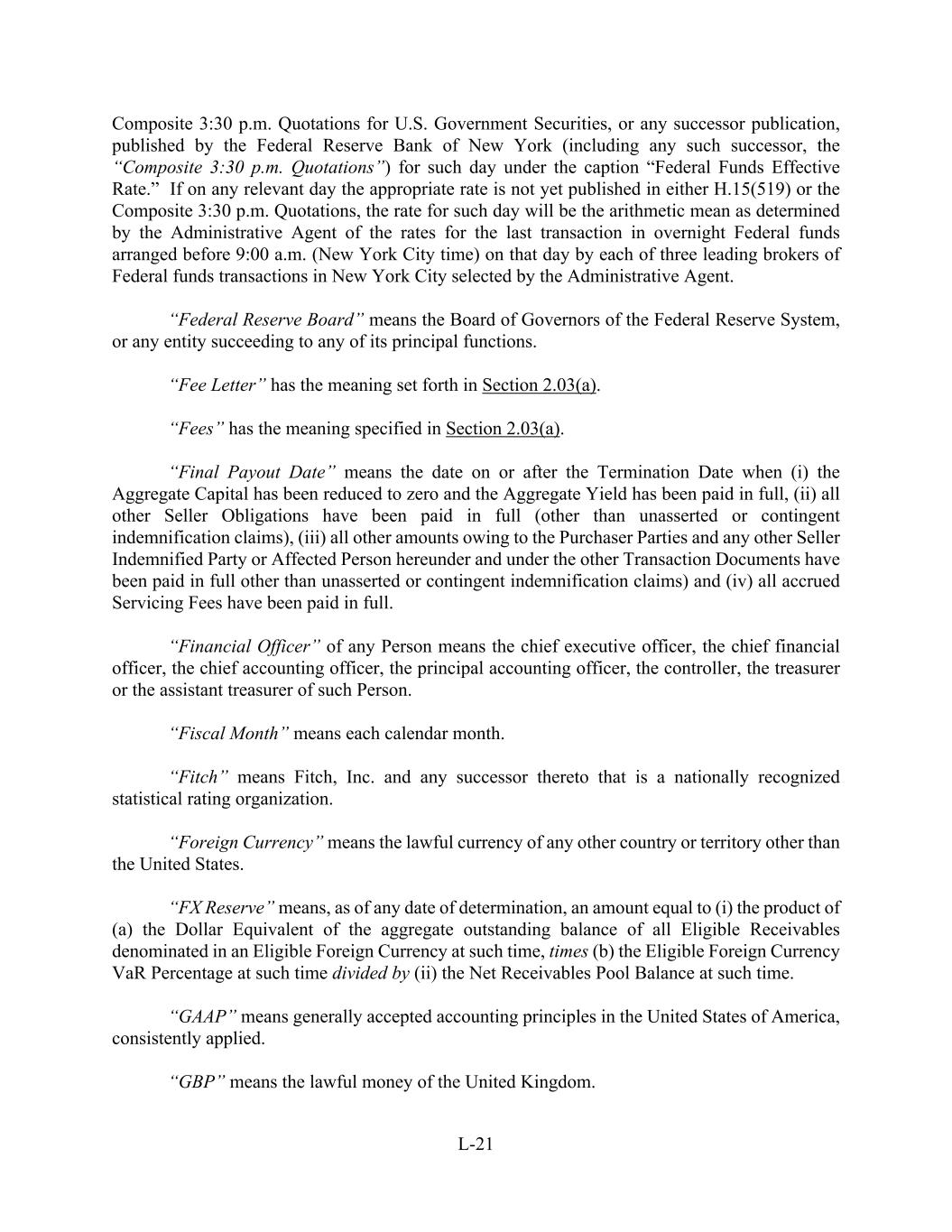L-21 Composite下午3:30纽约联邦储备银行在“联邦基金有效利率”标题下发布的美国政府证券或任何后续出版物的报价(包括任何此类后续,“Composite下午3:30报价”)。如果在任何相关日期,合适的利率尚未在H.15(519)或下午3:30的综合报价中公布,则该日期的利率将是行政代理人选定的纽约市联邦基金交易的三家主要经纪商各自在当天上午9:00(纽约市时间)之前安排的隔夜联邦基金最后一笔交易的利率的算术平均值。“联邦储备委员会”是指联邦储备系统的理事会,或接替其任何主要职能的任何实体。“收费信函”具有第2.03(a)节规定的含义。“费用”具有第2.03(a)节规定的含义。“最终支付日期”是指终止日期当日或之后的日期,其中(i)总资本降至零且总收益率已全额支付,(ii)所有其他卖方义务已全额支付(未主张或或有赔偿要求除外),(iii)根据本协议和其他交易文件欠买方各方和任何其他卖方受赔偿方或受影响人士的所有其他款项已全额支付,但未主张或或有赔偿要求除外),以及(iv)所有应计服务费已全额支付。任何人的“财务总监”指该人的首席执行官、首席财务官、首席会计官、首席会计官、控制人、司库或助理司库。“财政月”是指每个日历月。“惠誉”是指Fitch,Inc.及其任何继承者,即国家认可的统计评级组织。“外币”是指除美国以外的任何其他国家或地区的法定货币。“外汇储备”是指,截至任何确定日期,金额等于(i)(a)当时以合格外币计价的所有合格应收账款的未偿余额总额的等值美元乘以(b)当时的合格外币VaR百分比除以(ii)当时的应收账款净池余额的乘积。“GAAP”是指美国公认会计原则,一贯适用。“英镑”是指英国的合法货币。