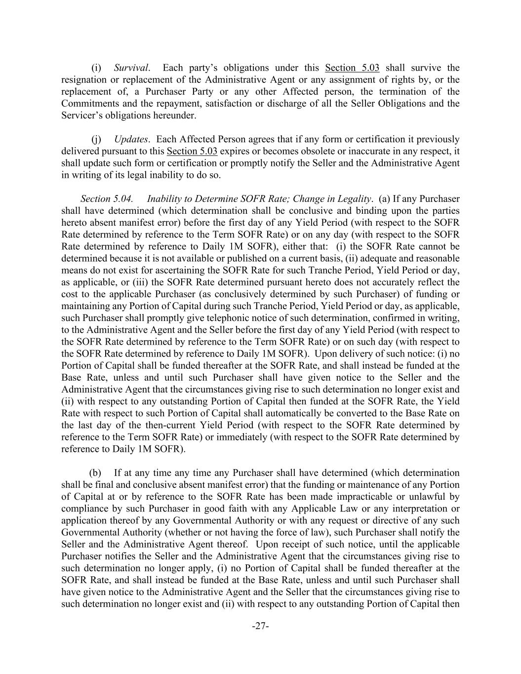 -27-(i)生存。每一方在本条第5.03款下的义务应在行政代理人的辞职或更换或买方或任何其他受影响的人的任何权利转让或更换、承诺的终止以及所有卖方义务和服务商在本协议下的义务的偿还、清偿或解除后继续有效。(j)更新。每名受影响人士同意,如其先前根据本条第5.03款交付的任何表格或证明在任何方面过期或过时或不准确,其应更新该表格或证明或迅速以书面通知卖方和行政代理人其在法律上无法这样做。第5.04节。无法确定SOFR率;合法性变更。(a)如任何买方在任何收益期的第一天(就参照定期SOFR利率确定的SOFR利率而言)或在任何一天(就参照每日1M SOFR确定的SOFR利率而言)之前(该确定应是决定性的,并对合同各方具有约束力,则:(i)SOFR利率无法确定,因为该利率无法获得或在当前基础上公布,(ii)不存在确定该批次期间的SOFR利率的充分和合理手段,收益期或日(如适用),或(iii)依据本协议确定的SOFR费率未能准确反映适用买方(由该买方最终确定)在该分档期、收益期或日(如适用)提供资金或维持任何部分资本的成本,该买方应迅速就该确定发出电话通知,并以书面确认,在任何收益期的第一天之前(就参照定期SOFR利率确定的SOFR利率而言)或在该日(就参照每日1M SOFR确定的SOFR利率而言)向行政代理人和卖方。在发出该通知后:(i)此后不得以SOFR费率为任何部分的资本提供资金,而应以基本费率为其提供资金,除非且直至该买方已向卖方和行政代理人发出通知,表明引起这种确定的情况已不复存在,并且(ii)就当时以SOFR费率提供资金的任何未偿还部分的资本而言,该部分资本的收益率应在当时的收益期的最后一天自动转换为基本利率(就参照定期SOFR利率确定的SOFR利率而言)或立即(就参照每日1M SOFR确定的SOFR利率而言)。(b)如任何买方在任何时间(不论是否具有法律效力)已确定(该确定应是最终和结论性的,无明显错误),由于该买方善意地遵守任何适用法律或任何政府当局对其的任何解释或适用,或遵守任何该等政府当局的任何请求或指示(不论是否具有法律效力),以SOFR费率或参照SOFR费率为任何部分资本提供资金或维持已变得不可行或不合法,则该买方应将此通知卖方和行政代理人。在收到此种通知后,直至适用的买方通知卖方和行政代理人导致作出此种确定的情况不再适用为止,(i)此后不得按SOFR费率为任何部分资本提供资金,而应改为按基本费率提供资金,除非并直至该买方已向行政代理人和卖方发出通知,导致作出此种确定的情况不再存在,以及(ii)就当时任何未偿还的资本部分而言