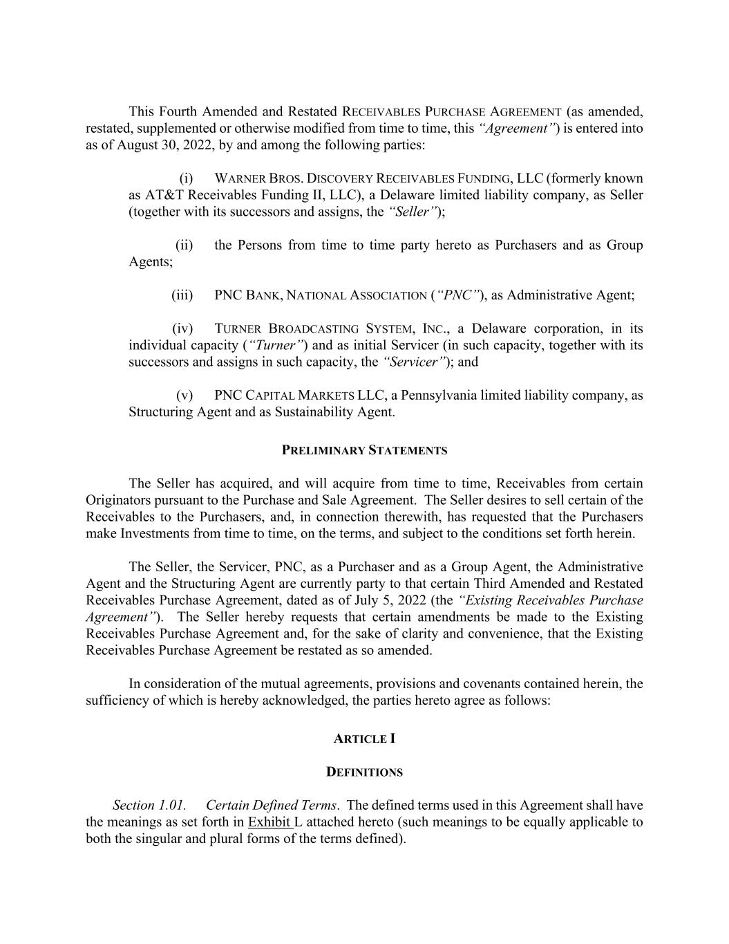 本第四份经修订和重述的应收款购买协议(经不时修订、重述、补充或以其他方式修改,本“协议”)由以下各方于2022年8月30日订立:(i)WARNER BROS。Discovery Receivables Funding,LLC(原名:美国电话电报 Receivables Funding II,LLC),一家特拉华州有限责任公司,作为卖方(连同其继任者和受让人,“卖方”);(ii)不时作为买方和集团代理的本协议当事人;(iii)美国国家协会(“PNC”)作为行政代理人;(iv)TURNER broadcasting System,INC.,一家特拉华州公司,以其个人身份(“Turner”)和作为初始服务商(以该身份,连同其继任者和受让人,以该身份,“服务商”);及(v)TERM0作为构造剂和可持续性代理。初步报表卖方已根据买卖协议收购并将不时收购若干发起人的应收款项。卖方希望将某些应收账款出售给买方,并就此要求买方不时根据条款和在此规定的条件下进行投资。卖方、服务商、PNC、作为买方以及作为集团代理、行政代理和结构化代理目前是日期为2022年7月5日的某些第三次经修订和重述的应收账款购买协议(“现有应收账款购买协议”)的当事方。卖方特此请求对现有应收款购买协议进行某些修订,并为清晰和方便起见,对现有应收款购买协议进行如此修订的重述。考虑到本协议所载的相互协议、规定和约定,兹确认其充分性,本协议各方同意如下:第一条定义第1.01节。某些定义的术语。本协议中使用的已定义术语应具有随附的附件 L中规定的含义(这些含义应同样适用于已定义术语的单数和复数形式)。