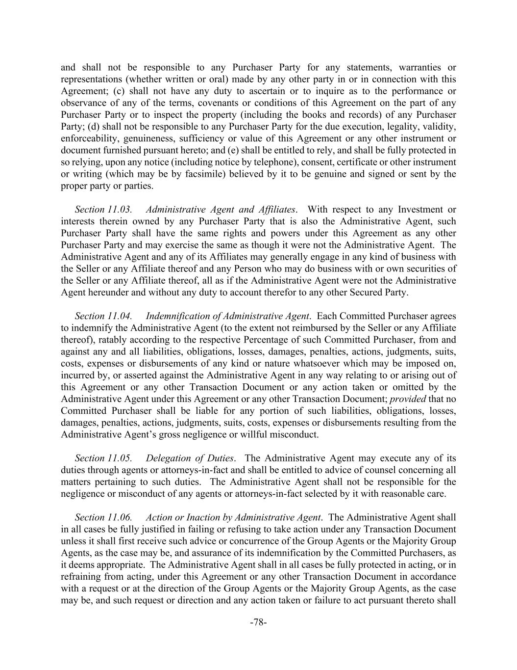 -78-且不对任何其他方就本协议或与本协议相关作出的任何陈述、保证或陈述(无论是书面的还是口头的)向任何买方方负责;(c)不承担任何责任确定或查询任何买方方履行或遵守本协议的任何条款、契诺或条件,或检查任何买方方的财产(包括账簿和记录);(d)不对任何买方方应有的执行、合法性、有效性、可执行性、真实性负责,本协议或根据本协议提供的任何其他文书或文件的充分性或价值;及(e)有权依赖任何通知(包括电话通知)、同意书、证书或其他其认为是真实的并由适当一方或多方签署或发送的文书或书面文件(可能是传真),并在此依赖时受到充分保护。第11.03节。行政代理人和附属机构。对于同时也是行政代理人的任何买方一方在其中拥有的任何投资或权益,该买方一方在本协议项下应享有与任何其他买方一方相同的权利和权力,并可行使与其不是行政代理人相同的权利和权力。行政代理人及其任何关联机构一般可与卖方或其任何关联机构以及可能与卖方或其任何关联机构的证券开展业务或拥有其证券的任何人开展任何类型的业务,所有这些业务均如同行政代理人并非本协议项下的行政代理人一样,且无任何责任向任何其他有担保方说明。第11.04节。行政代理人的赔偿。每一承诺买方同意根据该承诺买方各自的百分比,对行政代理人(在卖方或其任何关联公司未偿还的范围内)作出赔偿,使其免受任何和所有可能被施加、招致的任何类型或性质的任何责任、义务、损失、损害、处罚、诉讼、判决、诉讼、费用、费用或支出,或以任何与本协议或任何其他交易文件有关或因本协议或任何其他交易文件或行政代理人根据本协议或任何其他交易文件采取或遗漏的任何行动而对行政代理人提出的主张;但任何承诺的买方不得对因行政代理人的重大过失或故意不当行为而导致的该等责任、义务、损失、损害、处罚、诉讼、判决、诉讼、费用、开支或支出的任何部分承担责任。第11.05节。授权职责。行政代理人可以通过代理人或事实上的律师执行其任何职责,并有权就与该职责有关的所有事项获得律师的建议。行政代理人不得对其合理谨慎选择的任何代理人或事实上的律师的疏忽或不当行为承担责任。第11.06节。行政代理人作为或不作为。行政代理人在任何情况下均应有充分理由不采取或拒绝根据任何交易文件采取行动,除非其应首先收到集团代理人或多数集团代理人(视情况而定)的建议或同意,以及其认为适当的承诺买方对其赔偿的保证。行政代理人在任何情况下均应在根据本协议或任何其他交易文件根据请求或在集团代理人或多数集团代理人(视情况而定)的指示行事或不行事方面得到充分保护,而该请求或指示以及根据该请求或指示采取的任何行动或未根据该请求或指示行事的任何行动均应