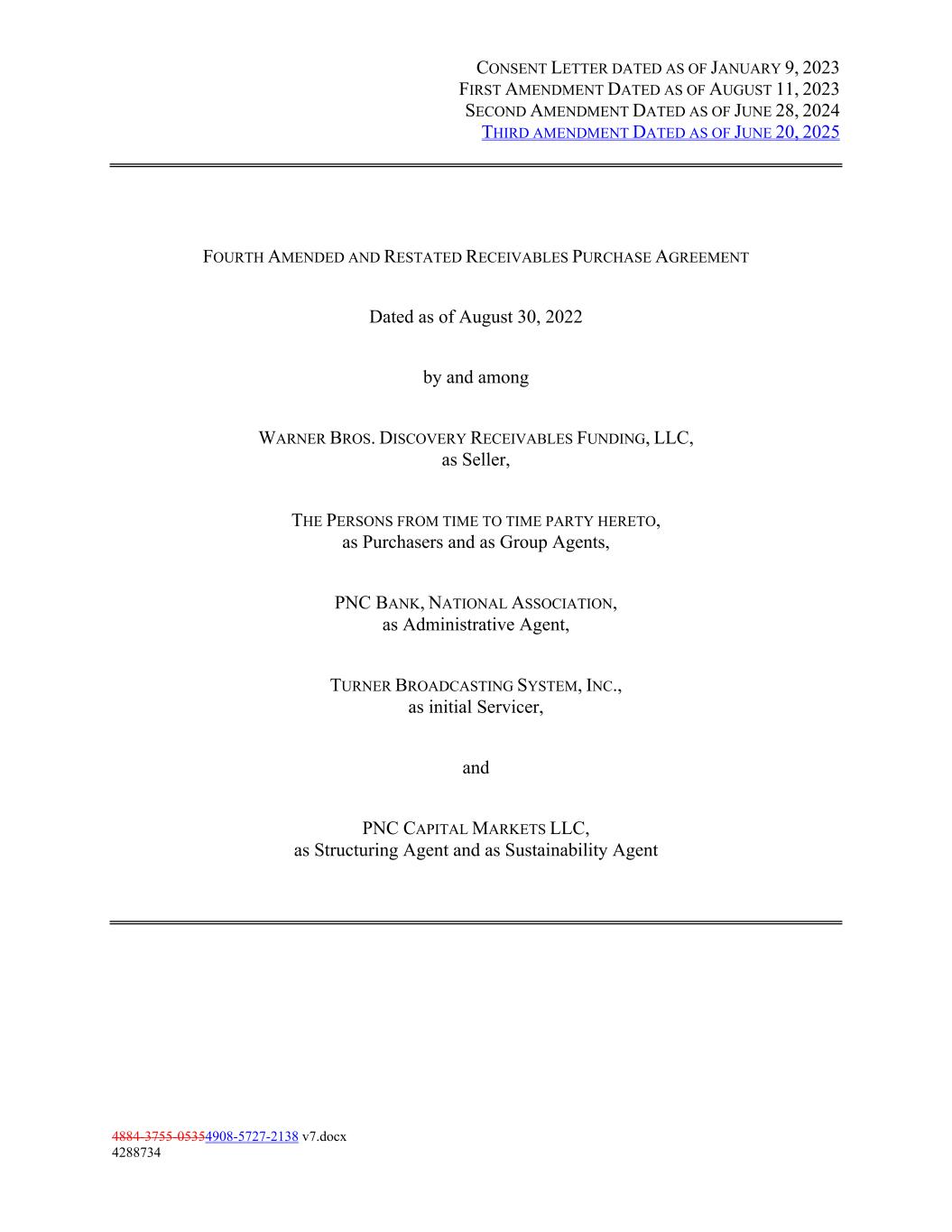 截至2023年1月9日的同意书截至2023年8月11日的第一次修订截至2024年6月28日的第二次修订截至2025年6月20日的第三次修订4884-3755-05354908-5727-2138 v7.docx4288734经修订和重述的截至2022年8月30日的应收款购买协议由及在买方兄弟之间。Discovery Receivables Funding,LLC,as seller,the person from time to time party hereto,as purchasers and as group agents,PNC Bank,National Association,as administrative agent,TURNer Broadcasting System,INC. as initial servicer,and PNC CAPITAL MarketS LLC as structuring agent and as sustainability agent