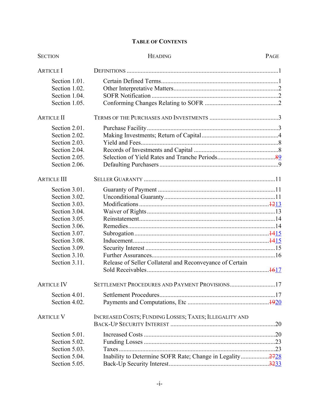 -i-目录部分标题页第一条定义................................................................................................1第1.01节。某些定义术语................................................................................1第1.02节。其他解释性事项...................................................................2第1.04节。SOFR通知....................................................................................2第1.05节。与SOFR相关的符合性变更....................................................2第二条购买和投资的条款....................................................3第2.01节。购买便利....................................................................................3第2.02节。进行投资;返还资本....................................................4第2.03节。收益率和费用......................................................................................8第2.04节。投资和资本记录......................................................8第2.05节。收益率和档期的选择.....................................89第2.06节。违约买方....................................................................................9条第三款卖方担保....................................................................................11第3.01节。付款保证...................................................................................11第3.02节。无条件保证....................................................................11第3.03节。修改...................................................................................12 13第3.04节。放弃权利.................................................................................... 13第3.05节。恢复原状...................................................................................14第3.06节。补救措施......................................................................................14第3.07节。代位权......................................................................................1 415第3.08节。诱导...................................................................................1415第3.09节。担保权益...................................................................................15第3.10节。进一步保证...................................................................................16第3.11节。…………………………………………………………………………………………………………………………………………………………………………………………………………………………………………………………………………………………………………………………………………………………………………………………………………………………………………………………………………………………………………………………………………………………………………………………………………………………………………………………………………………………………………………………………………………………………………………………………………………………………………………………………………………………结算程序...................................................................................17第4.02节。付款和计算等....................................................1920年第五条增加的费用;资金损失;税收;违法和备用担保权益...................................................................20第5.01节。成本增加....................................................................................20第5.02节。资金损失...................................................................................23第5.03节。税收...................................................................................................23第5.04节。无法确定SOFR率;合法性变更..................2728第5.05节。备用担保权益...................................................................32 3 3