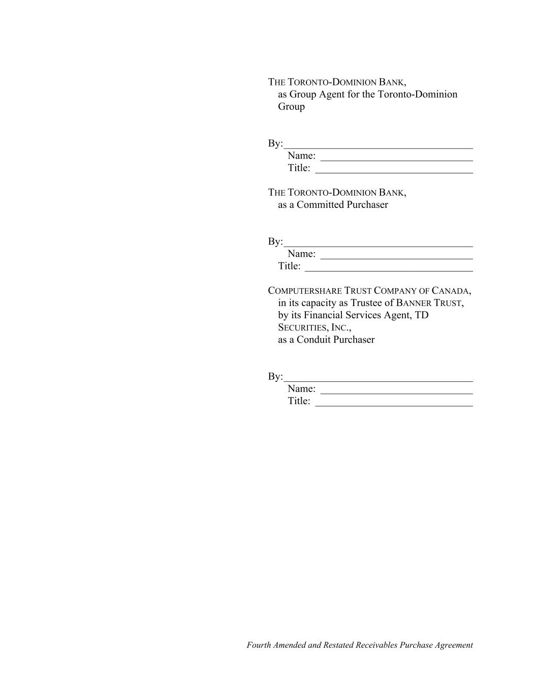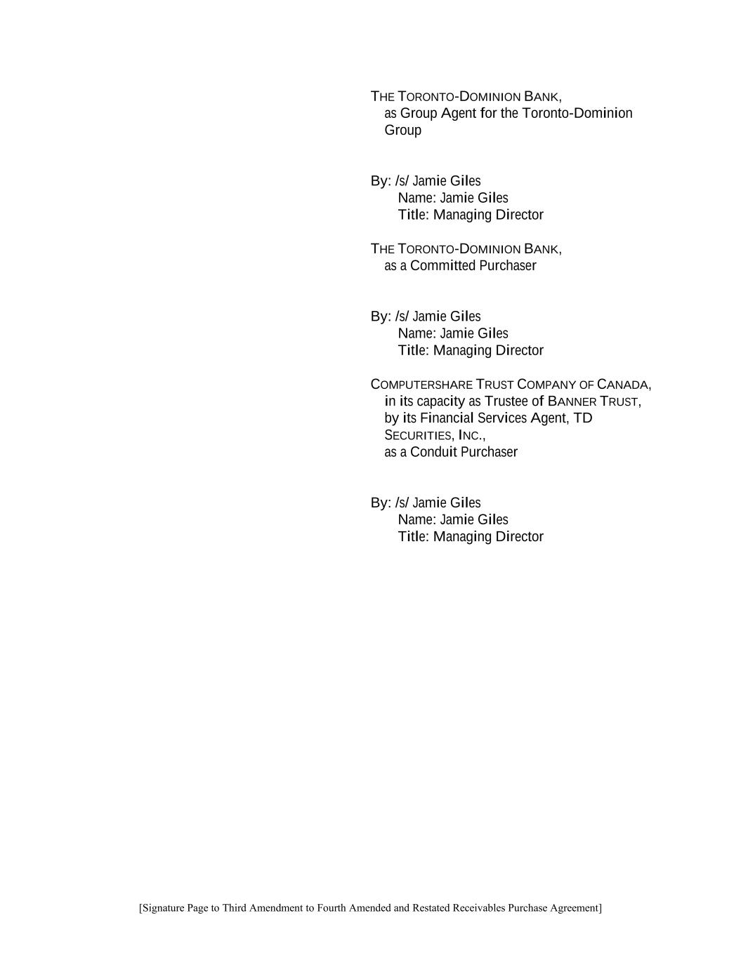 【第四次修订和重述的应收账款购买协议第三修正案签署页】多伦多-多米尼克银行,作为多伦多-多米尼克集团的集团代理,作者:/s/Jamie Giles姓名:Jamie Giles职务:多伦多-多米尼克银行董事总经理,作为承诺的购买者:/s/Jamie Giles姓名:Jamie Giles职务:加拿大计算机股份信托公司董事总经理,以BANNER TRUST受托人的身份,由其金融服务代理TD SECURITIES,INC.作为管道购买者,作者:/s/Jamie Giles姓名:Jamie Giles职务:董事总经理