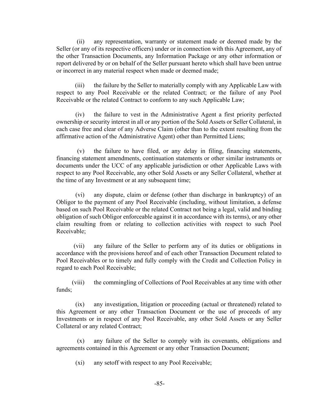 -85-(ii)卖方(或其各自的任何高级人员)根据本协议、任何其他交易文件或与本协议、任何其他交易文件相关或与本协议相关作出或视为作出的任何陈述、保证或陈述,由卖方或代表卖方根据本协议交付的任何信息包或任何其他信息或报告,而这些信息或报告在作出或被视为作出时在任何重大方面均应是不真实或不正确的;(iii)卖方未能在实质上遵守与任何集合应收款或相关合同有关的任何适用法律;或任何集合应收款或相关合同未能遵守任何此类适用法律;(iv)未能赋予行政代理人第一优先权完善所有权或担保权益的所有或出售资产或卖方抵押品的任何部分,在每种情况下均不存在除许可留置权之外的任何不利债权(行政代理人肯定行动导致的范围除外);(v)未就任何应收账款池、任何其他已出售资产或任何卖方抵押品提交或任何延迟提交、融资报表、融资报表修订、延续报表或根据任何适用司法管辖区的UCC或其他适用法律下的其他类似文书或文件,(vi)债务人就任何集合应收款的付款提出的任何争议、申索或抗辩(破产解除除外)(包括但不限于基于该集合应收款的抗辩或相关合同不是该债务人根据其条款可对其强制执行的合法、有效和具有约束力的义务),(vii)卖方未能按照本协议的规定以及与集合应收款有关的相互交易文件履行其任何职责或义务,或未能及时和充分遵守关于每一集合应收款的信贷和收款政策;(viii)在任何时候将集合应收款的收款与其他资金混合;(ix)任何调查,与本协议或任何其他交易文件有关的诉讼或程序(实际的或威胁的)或任何投资的收益使用或与任何应收集合、任何其他出售资产或任何卖方抵押品或任何相关合同有关的诉讼或程序;(x)卖方未能遵守本协议或任何其他交易文件所载的其契诺、义务和协议;(xi)与任何应收集合有关的任何抵销;