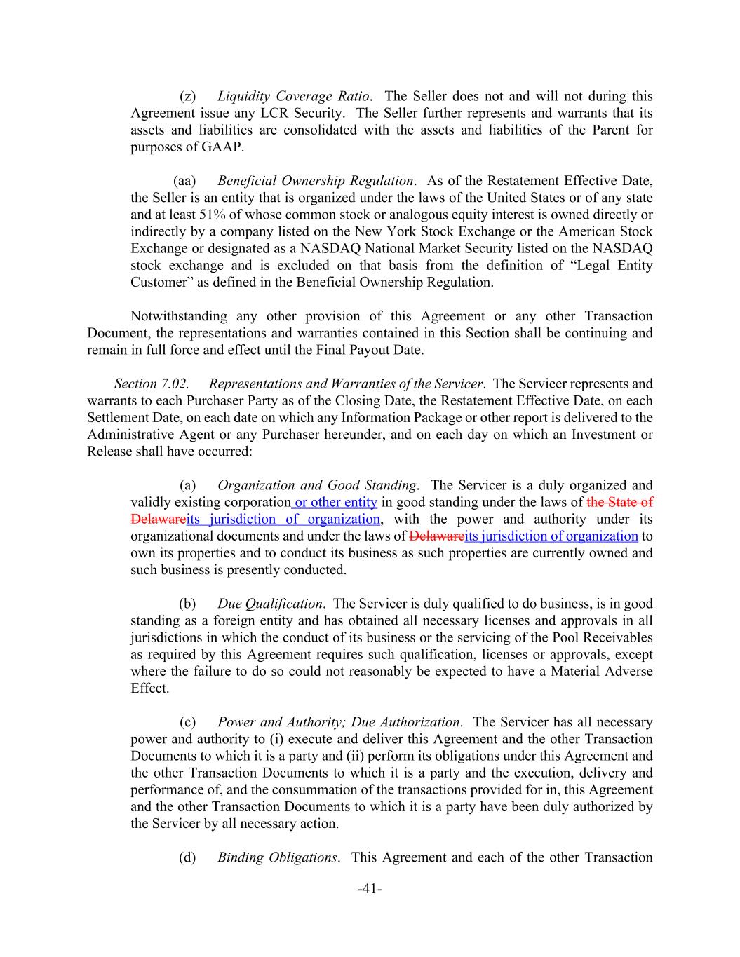 -41-(z)流动性覆盖率。卖方不会也不会在本协议期间发行任何LCR证券。卖方进一步声明并保证其资产和负债与母公司的资产和负债合并,以符合公认会计原则。(aa)实益所有权规制。截至重述生效日期,卖方是根据美国或任何州的法律组建的实体,其至少51%的普通股或类似股权由在纽约证券交易所或美国证券交易所上市的公司直接或间接拥有,或被指定为在纳斯达克证券交易所上市的纳斯达克国家市场证券,并在此基础上被排除在受益所有权条例中定义的“法人实体客户”定义之外。尽管有本协议或任何其他交易文件的任何其他规定,本节所载的陈述和保证应继续进行,并保持完全有效,直至最后付款日期。第7.02节。服务商的陈述和保证。服务商在截止日期、重述生效日期、每个结算日、向本协议项下的行政代理人或任何买方交付任何信息包或其他报告的每个日期以及应已发生投资或解除的每一天向每一买方代表并保证:(a)组织和良好信誉。服务商是一家根据其组织管辖权的特拉华州法律具有良好信誉的正式组织和有效存在的公司或其他实体,根据其组织文件和根据其组织管辖权的特拉华州法律拥有拥有其财产和开展其业务的权力和权力,因为这些财产目前拥有并目前正在开展此类业务。(b)适当资格。服务商具有开展业务的适当资格,作为外国实体具有良好的信誉,并已在所有法域获得所有必要的许可和批准,而根据本协议的要求开展其业务或为集合应收款提供服务需要此类资格、许可或批准,除非无法合理地预期未能这样做会产生重大不利影响。(c)权力和权威;适当授权。服务商拥有一切必要的权力和权力,可以(i)执行和交付本协议及其作为一方当事人的其他交易文件,以及(ii)履行其在本协议及其作为一方当事人的其他交易文件项下的义务,并且本协议及其作为一方当事人的其他交易文件中规定的交易的执行、交付和履行以及完成均已得到服务商通过一切必要行动的正式授权。(d)具有约束力的义务。本协议及其他交易各