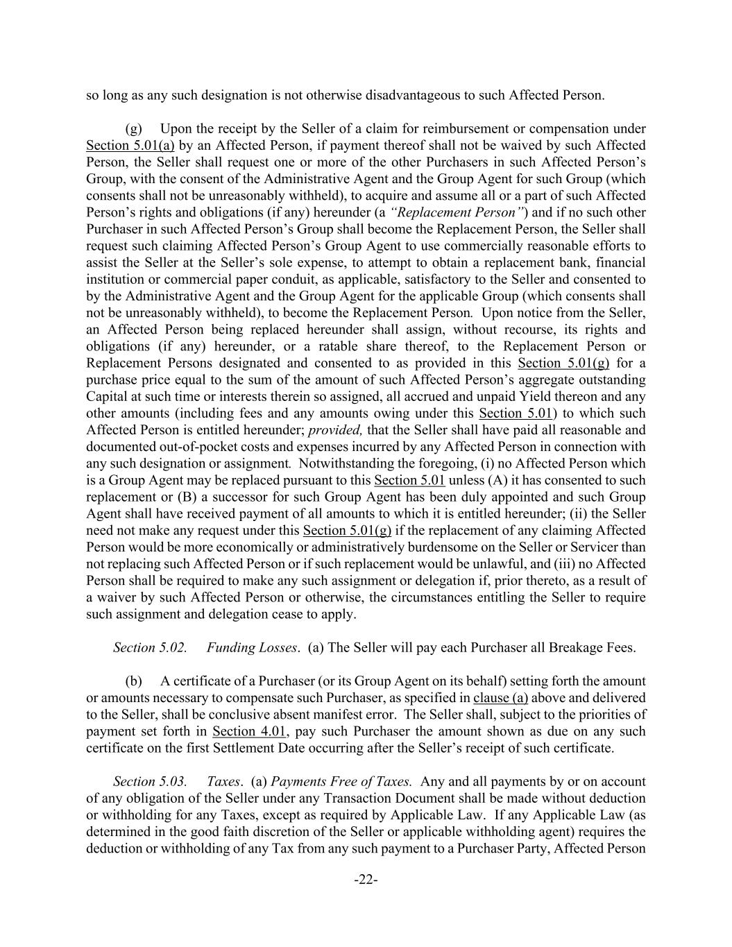 -22-只要任何此类指定不会在其他方面对此类受影响的人不利。(g)在卖方收到受影响人士根据第5.01(a)条提出的补偿或赔偿要求后,如该受影响人士不放弃支付,则卖方须要求该受影响人士集团中的一名或多名其他买方,但须征得该行政代理人和该集团的集团代理人的同意(不得无理拒绝同意),收购并承担该受影响人在本协议项下的全部或部分权利和义务(如有)(“替代人”),如果该受影响人的集团中没有该等其他买方成为替代人,则卖方应要求该索赔受影响人的集团代理人以商业上合理的努力协助卖方,由卖方承担全部费用,试图获得替代银行、金融机构或商业票据渠道(如适用),令卖方满意,并经行政代理人及适用集团的集团代理人同意(其同意不得无理拒绝),成为替代人。在收到卖方通知后,根据本协议被替换的受影响人应无追索权地将其在本协议下的权利和义务(如有的话)或其中的应课税份额转让给根据本条第5.01(g)条规定指定并同意的被替换人或被替换人,购买价格等于该受影响人在该时间的未偿资本总额或如此转让的其中权益的总和,该受影响人根据本协议有权获得的所有应计和未支付的收益率以及任何其他金额(包括费用和根据本条第5.01条所欠的任何金额);但卖方应已支付任何受影响人因任何此类指定或转让而产生的所有合理且有文件证明的自付费用和开支。尽管有上述情况,(i)任何身为集团代理人的受影响人,均不得依据本条被替换,除非(a)其已同意该等替换,或(b)该集团代理人的继任人已获妥为委任,而该集团代理人须已收到其根据本条例有权获得的所有款项的付款;(ii)卖方无须根据本条提出任何要求(g),如任何申索受影响人的替换将比不替换该受影响人的经济或行政负担更重,或该等替换将属非法,及(iii)如在此之前,由于该受影响人士的放弃或其他原因,使卖方有权要求该等转让及转授的情况不再适用,则任何受影响人士均无须作出任何该等转让或转授。第5.02节。资金损失。(a)卖方将向每位买方支付所有破碎费。(b)如上文(a)条所指明并交付卖方的买方(或代表其的集团代理人)的证明书,列明补偿该买方所需的一项或多项金额,在没有明显错误的情况下,该证明书即为结论性的。卖方应根据第4.01节规定的付款优先顺序,在卖方收到此类证书后发生的第一个结算日向该买方支付任何此类证书上显示的到期金额。第5.03节。税。(a)免税支付。除适用法律要求外,卖方根据任何交易文件所承担的任何义务或由此承担的任何和所有付款均应在不扣除或预扣任何税款的情况下进行。如果任何适用法律(由卖方或适用的扣缴义务人善意酌处权确定)要求从支付给买方一方的任何此类付款中扣除或扣缴任何税款,受影响的人