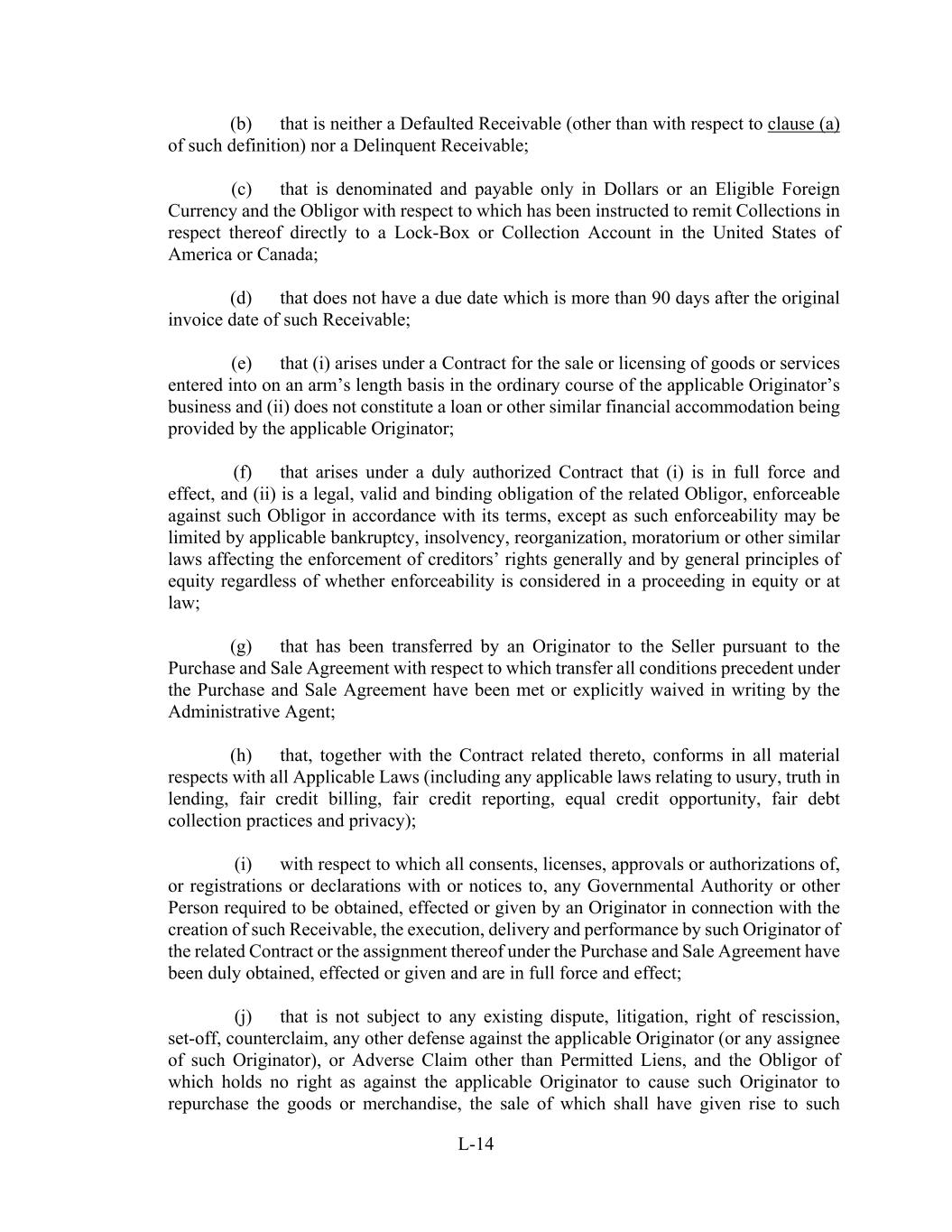 L-14(b)既不是违约的应收款项(就该定义的(a)款而言除外)也不是拖欠的应收款项;(c)仅以美元或合格外币计价和应付,且已指示债务人将有关收款直接汇入美利坚合众国或加拿大的Lock-Box或收款账户;(d)到期日不超过该应收款项的原始发票日期90天;(e)(i)根据在适用的发起人的正常业务过程中公平交易订立的货物或服务的销售或许可合同产生,且(ii)不构成由适用的发起人提供的贷款或其他类似的财务便利;(f)根据正式授权的合同产生的(i)具有完全效力和效力,且(ii)是相关债务人的一项法律、有效和具有约束力的义务,可根据其条款对该债务人强制执行,但此类可执行性可能因适用的破产、无力偿债、重组而受到限制,暂停执行或其他类似法律,影响债权人权利的一般强制执行和按一般权益原则强制执行,而不论在股权程序或法律程序中是否考虑可强制执行;(g)发起人根据《买卖协议》转让给卖方的,就该协议转让《买卖协议》项下的所有先决条件已由行政代理人以书面满足或明确放弃;(h)连同与之相关的合同,在所有重大方面均符合所有适用法律(包括与高利贷、借贷真相、公平信贷账单、公平信用报告、平等信贷机会、公平讨债做法和隐私有关的任何适用法律);(i)与此相关的所有同意、许可、批准或授权,或向任何政府当局或其他人进行的登记、声明或通知,均需由发起人就此类应收款的设定、执行、(j)不受任何现有争议、诉讼、撤销权、抵销权、反申索、针对适用的发起人(或该发起人的任何受让人)的任何其他抗辩或除许可留置权以外的不利申索的约束,且其义务人相对于适用的发起人无权促使该发起人回购货物或商品,其出售应已引起该等
