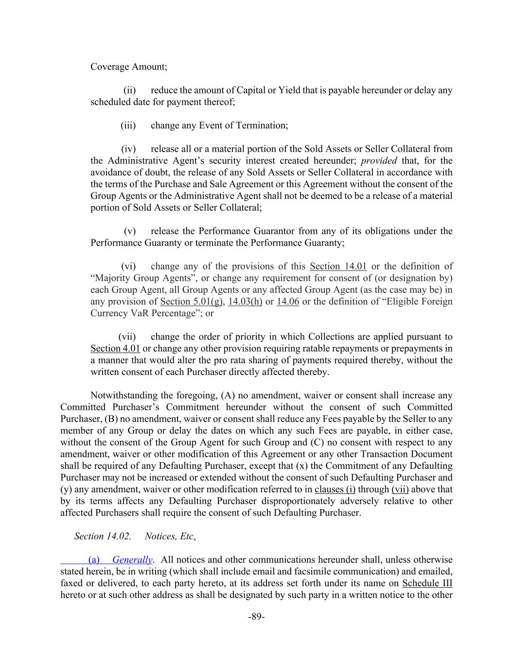 -89-承保金额;(ii)减少根据本协议应支付的资本或收益金额或延迟任何预定的支付日期;(iii)更改任何终止事件;(iv)从行政代理人根据本协议设定的担保权益中解除全部或重要部分出售资产或卖方担保物;但为免生疑问,未经集团代理人或行政代理人同意,根据买卖协议或本协议的条款解除任何出售资产或卖方担保物,不应被视为解除出售资产或卖方担保物的重要部分;(v)解除履约担保人在履约担保项下的任何义务或终止履约担保;(vi)更改本条第14.01条的任何规定或“多数集团代理人”的定义,或更改第5.01(g)、14.03(h)或14.06条的任何规定或“合格外币VaR百分比”的定义中关于每个集团代理、所有集团代理或任何受影响集团代理(视情况而定)的同意(或指定)的任何要求;或(vii)更改根据第4.01条适用收款的优先顺序或更改任何其他要求按比例还款或预付款项的规定,其方式将改变由此所要求的按比例分摊付款,而无需直接受其影响的每个买方的书面同意。尽管有上述规定,(a)未经承诺买方同意,任何修订、放弃或同意均不得增加承诺买方在本协议项下的承诺,(b)任何修订、放弃或同意均不得减少卖方应付任何集团任何成员的任何费用或延迟任何此类费用的支付日期,在任何情况下,未经集团对该集团的代理同意,以及(c)任何违约买方均不得就本协议或任何其他交易文件的任何修订、放弃或其他修改获得同意,除非(x)任何违约买方的承诺未经该违约买方同意不得增加或延长,以及(y)上文第(i)至(vii)条中提及的任何修订、豁免或其他修改,其条款对任何违约买方的影响相对于其他受影响的买方而言不成比例地不利,均须获得该违约买方的同意。第14.02节。通告等(a)通则。除本文另有说明外,本协议项下的所有通知和其他通信均应以书面形式(其中应包括电子邮件和传真通信),并以电子邮件、传真或递送方式发送至本协议每一方、在本协议附表III其名下所列的地址或在该一方在给另一方的书面通知中指定的其他地址