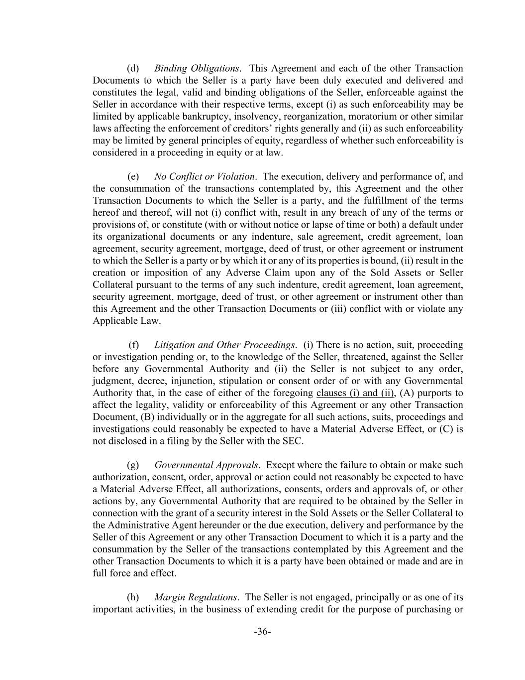 -36-(d)具有约束力的义务。本协议和卖方作为一方当事人的每一份其他交易文件均已正式签署和交付,构成卖方的法律、有效和具有约束力的义务,可根据各自的条款对卖方强制执行,但(i)此类可执行性可能受到适用的破产、破产、重组、暂停执行或其他影响一般强制执行债权人权利的类似法律的限制,以及(ii)由于此类可执行性可能受到一般衡平法原则的限制,无论在股权程序中还是在法律上考虑此类可执行性。(e)没有冲突或违反行为。本协议和卖方作为一方的其他交易文件的执行、交付和履行以及所设想的交易的完成,以及本协议及其条款的履行,不会(i)与其组织文件或任何契约、销售协议、信贷协议、贷款协议、担保协议、抵押、信托契据项下的任何条款或规定发生冲突、导致任何违反,或构成(无论是否有通知或时间流逝或两者兼而有之)违约,或卖方作为一方当事人或其或其任何财产受其约束的其他协议或文书,(ii)导致根据任何此类契约、信贷协议、贷款协议、担保协议、抵押、信托契据或本协议和其他交易文件以外的其他协议或文书的条款对任何已售资产或卖方抵押品产生或施加任何不利债权,或(iii)与任何适用法律相冲突或违反。(f)诉讼和其他程序。(i)在任何政府当局面前没有任何针对卖方的诉讼、诉讼、程序或调查待决或据卖方所知受到威胁,以及(ii)卖方不受任何政府当局的任何命令、判决、法令、强制令、规定或同意令的约束,而在上述(i)和(ii)条款中的任何一项的情况下,(a)旨在影响本协议或任何其他交易文件的合法性、有效性或可执行性,(b)就所有此类诉讼、诉讼单独或合计而言,可以合理地预期诉讼和调查会产生重大不利影响,或者(c)未在卖方向SEC提交的文件中披露。(g)政府批准。除非未能获得或作出此类授权、同意、命令、批准或行动不能合理地预期会产生重大不利影响,否则卖方就根据本协议向行政代理人授予所售资产的担保权益或卖方担保物或适当执行而必须获得的任何政府当局的所有授权、同意、命令和批准或其他行动,卖方交付和履行其作为当事方的本协议或任何其他交易文件以及卖方完成本协议所设想的交易及其作为当事方的其他交易文件均已获得或作出,并具有充分的效力和效力。(h)保证金规定。卖方主要或作为其重要活动之一,并无从事为购买或