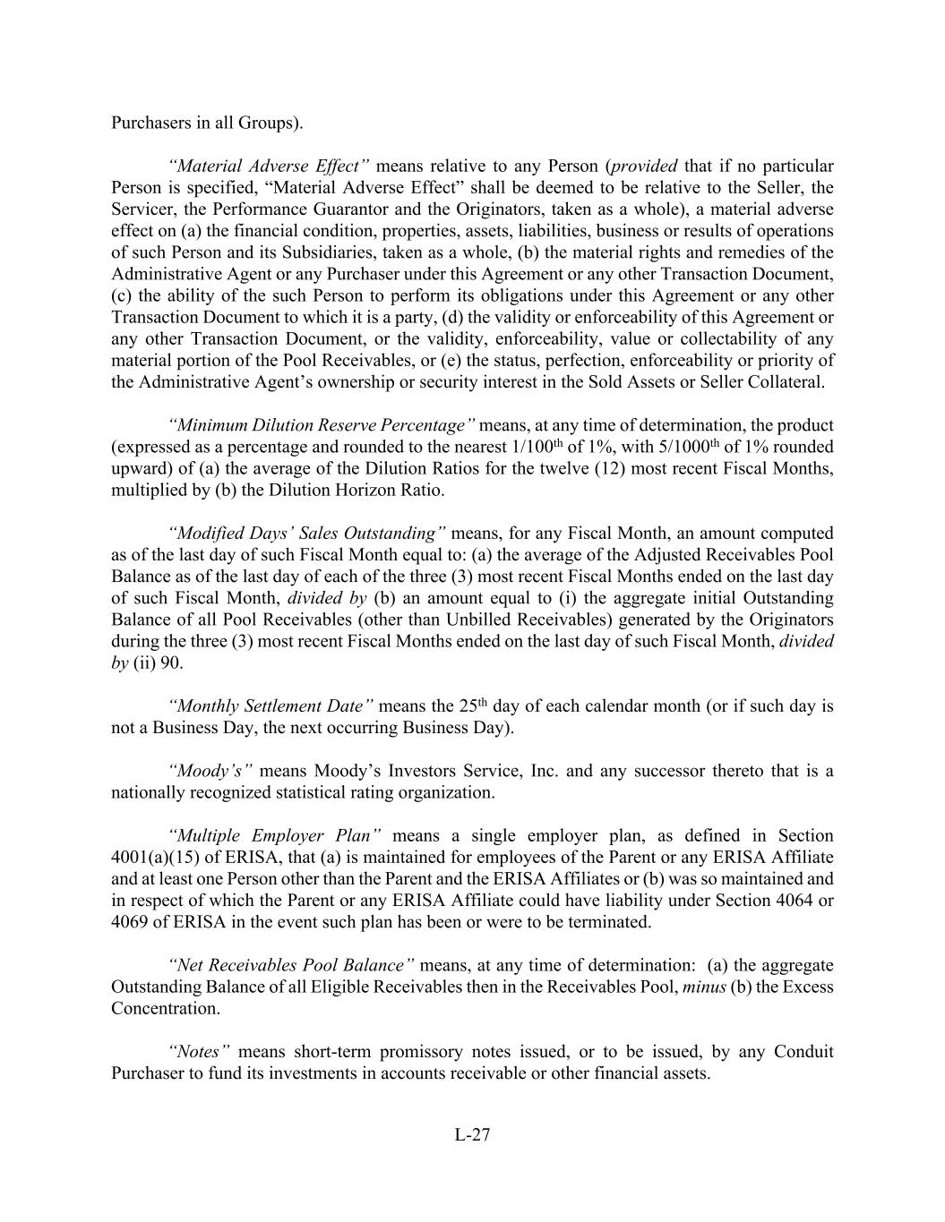 所有集团的L-27采购商)。“重大不利影响”是指相对于任何人(但如未指明特定人,则“重大不利影响”应被视为相对于卖方、服务商、履约担保人和发起人,作为一个整体),对(a)该人及其子公司的财务状况、财产、资产、负债、业务或经营业绩,作为一个整体,(b)行政代理人或任何买方在本协议或任何其他交易文件项下的重大权利和补救措施,(c)该人履行其在本协议或其作为当事方的任何其他交易文件项下义务的能力,(d)本协议或任何其他交易文件的有效性或可执行性,或集合应收款的任何重要部分的有效性、可执行性、价值或可收回性,或(e)行政代理人对出售资产或卖方抵押品的所有权或担保权益的状态、完善性、可执行性或优先权。“最小稀释准备金百分比”是指,在确定的任何时候,(a)最近十二(12)个财政月的稀释比率的平均值乘以(b)稀释地平线比率的乘积(以百分比表示并四舍五入到1%的最接近的1/100,其中1%的5/1000向上四舍五入)。“修正未偿销售天数”是指,就任何一个财政月而言,截至该财政月最后一天计算的金额等于:(a)截至该财政月最后一天结束的最近三(3)个财政月中每个财政月的最后一天的调整后应收款项池余额的平均值,除以(b)等于(i)发起人在该财政月最后一天结束的最近三(3)个财政月中产生的所有应收款项池(未开票应收款项除外)的初始未偿余额总额的金额,除以(二)90。“每月结算日”是指每个日历月的第25天(或者,如果该日不是营业日,则为下一个发生的营业日)。“穆迪”是指穆迪投资者服务公司及其任何继承者,即国家认可的统计评级组织。“多雇主计划”是指ERISA第4001(a)(15)节所定义的单一雇主计划,该计划(a)是为母公司或任何ERISA关联公司的雇员以及除母公司和ERISA关联公司之外的至少一个人维持的,或(b)是如此维持的,如果该计划已经或将要终止,则母公司或任何ERISA关联公司可能根据ERISA第4064或4069条对此承担责任。“应收账款净额集合余额”是指,在任何确定时间:(a)应收账款池中当时所有符合条件的应收账款的未偿余额总和,减去(b)超额集中。“票据”是指任何管道买方为其应收账款或其他金融资产投资提供资金而发行或将发行的短期本票。