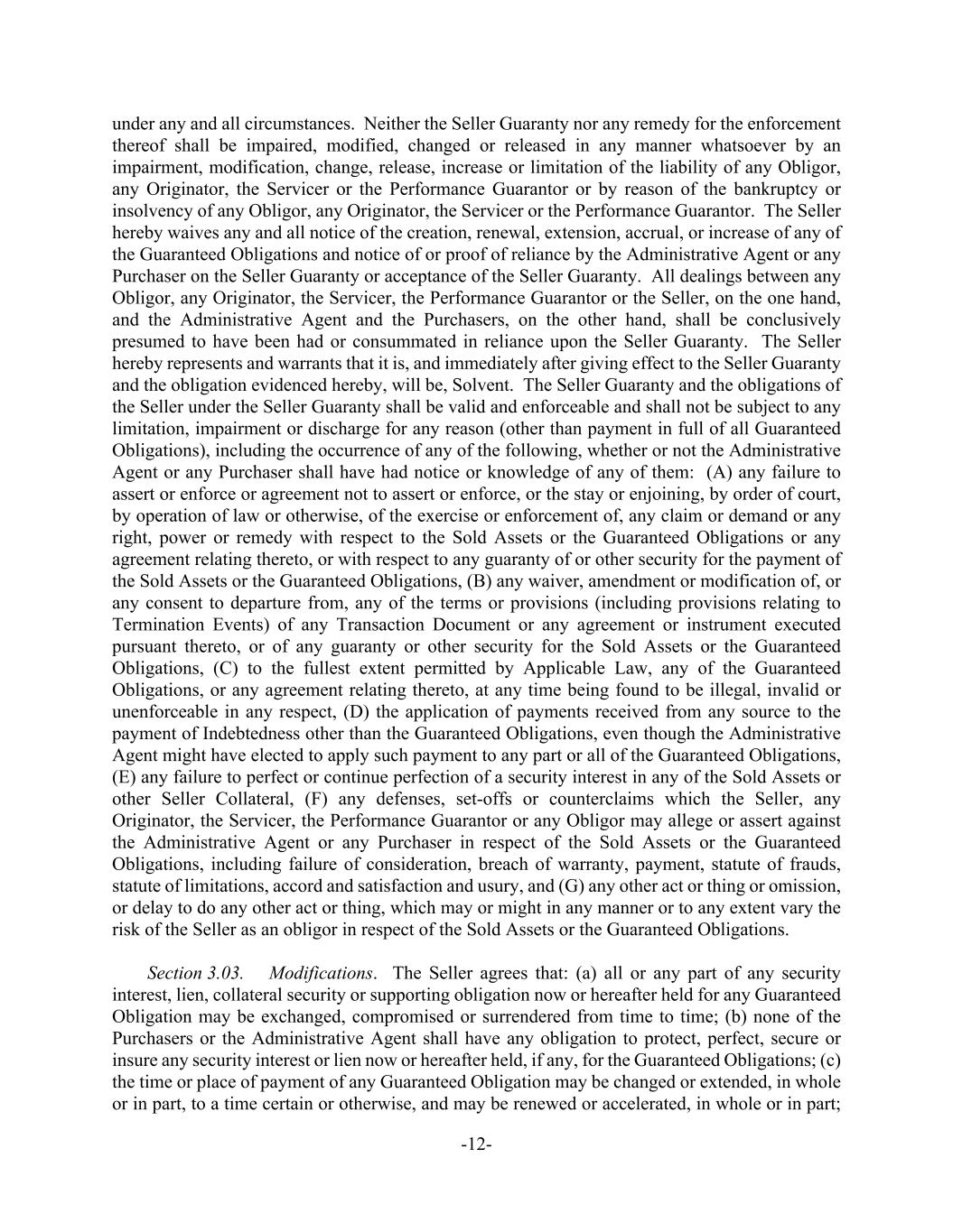 -12-在任何和所有情况下。卖方担保或其强制执行的任何补救措施,均不得因任何债务人、任何发起人、服务人或履约担保人的责任减值、变更、变更、解除、增加或限制或因任何债务人、任何发起人、服务人或履约担保人的破产或无力偿债而以任何方式减损、修改、变更或解除。卖方特此放弃任何和所有关于任何担保义务的设定、续期、延期、应计或增加的通知,以及行政代理人或任何买方对卖方担保的依赖或对卖方担保的接受的通知或证明。任何义务人、任何发起人、服务人、履约保证人或卖方,以及行政代理人和买方之间的所有交易,均应被最终推定为依赖卖方担保已经或已经完成。卖方在此声明并保证,它是,并且在卖方担保和在此证明的义务生效后立即,将是,溶剂。卖方担保和卖方担保项下的卖方义务应是有效和可执行的,不得因任何原因(全额支付所有担保义务除外)受到任何限制、减值或解除,包括发生以下任何情况,无论行政代理人或任何买方是否已通知或知悉其中任何一项:(a)任何未主张或强制执行或同意不主张或强制执行,或中止或禁止、通过法院命令、通过法律实施或其他方式,就出售资产或担保债务或与其有关的任何协议行使或强制执行、任何债权或要求或任何权利、权力或补救,或就支付出售资产或担保债务的任何担保或其他担保,(b)对任何交易文件或据此签立的任何协议或文书的任何条款或规定(包括与终止事件有关的规定)的任何放弃、修订或修改,或同意背离,或出售资产或担保债务的任何担保或其他担保,(c)在适用法律允许的最大范围内,任何担保债务或与此有关的任何协议在任何时候被发现在任何方面都是非法、无效或不可执行的,(d)将从任何来源收到的付款应用于担保债务以外的债务的支付,即使行政代理人可能已选择将此种付款应用于担保债务的任何部分或全部,(e)未能完善或继续完善任何已出售资产或其他卖方抵押品上的担保权益,(f)卖方、任何发起人、服务人、履约担保人或任何义务人就所出售资产或所担保义务可能针对行政代理人或任何买方提出或主张的任何抗辩、抵销或反诉,包括未能履行对价、违反保证、付款、欺诈法规、诉讼时效、和解和清偿以及高利贷,以及(g)任何其他作为或事情或不作为,或延迟作出任何其他行为或事情,这可能或可能以任何方式或在任何程度上改变卖方作为债务人就出售资产或担保义务所承担的风险。第3.03节。修改。卖方同意:(a)现在或以后为任何担保义务而持有的任何担保权益、留置权、抵押担保或支持义务的全部或任何部分,可不时交换、折衷或放弃;(b)买方或行政代理人均无义务保护、完善、担保或为现在或以后为担保义务而持有的任何担保权益或留置权(如有)提供保险;(c)任何担保义务的支付时间或地点可全部或部分更改或延长至某一特定时间或其他时间,并可全部或部分续展或加速;