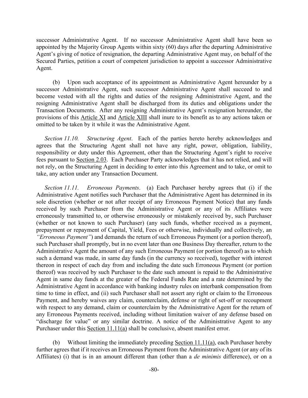 -80-继任行政代理人。继任行政代理人在离任行政代理人发出离职通知后六十(60)日内未获多数群体代理人如此委任的,离任行政代理人可以代表有担保当事人向有管辖权的法院请求指定继任行政代理人。(b)继任行政代理人接受其作为本协议项下行政代理人的委任后,该继任行政代理人应继承并归属离职行政代理人的所有权利和义务,离职行政代理人应解除其在交易文件项下的职责和义务。任何辞职的行政代理人在本合同项下离职后,其在担任行政代理人期间所采取的任何行动或未采取的任何行动,依照本条XI和第十三条的规定,对其有利。第11.10节。结构剂。本协议各方在此承认并同意,除结构代理根据第2.03节收取费用的权利外,结构代理在本协议项下不享有任何权利、权力、义务、责任、责任或义务。每一买方方承认,其在决定订立本协议以及根据任何交易文件采取或不采取任何行动时没有依赖、也不会依赖结构代理。第11.11节。错误的付款。(a)各买方在此同意(i)如行政代理人通知该买方,该行政代理人已全权酌情决定(不论是否在收到任何错误付款通知后)该买方从该行政代理人或其任何关联公司收到的任何资金被错误地传送给该买方,或由该买方(不论该买方是否知晓)以其他方式错误或错误地收到(任何该等资金,不论是否作为支付、预付或偿还资本、收益、费用或其他方式单独或集体收到,“误付”)并要求退回该误付款项(或其一部分),该买方应迅速(但在任何情况下不迟于其后一个工作日)向行政代理人退回作出该要求的任何该误付款项(或其一部分)的金额(以当日资金(以如此收到的货币),连同自该买方收到该错误付款(或其部分)之日(包括该日)至该款项按联邦基金利率和该行政代理人根据不时生效的银行业同业代偿规则确定的利率两者中较高者向该行政代理人偿还当日资金之日的每一天的利息,以及(ii)该买方不得主张对该错误付款的任何权利或主张,并特此放弃任何主张、反主张,就行政代理人要求返还收到的任何错误付款提出的任何要求、索赔或反索赔提出的抗辩或抵销或补偿权利,包括但不限于放弃基于“价值解除”或任何类似原则的任何抗辩。行政代理人根据本条第11.11(a)款向任何买方发出的通知应是结论性的,不存在明显错误。(b)在不限制前述第11.11(a)条的情况下,每一买方在此进一步同意,如果其从行政代理人(或其任何关联公司)(i)收到的错误付款的金额与(微量差异除外)不同,或在