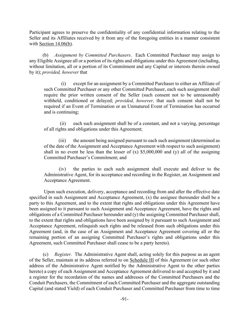 -91-参与者同意以符合第14.06(b)节的方式对其从上述任何实体收到的与卖方及其关联公司有关的任何机密信息进行保密。(b)承诺购买者的转让。各承诺买方可将其在本协议下的全部或部分权利和义务(包括但不限于其承诺的全部或部分以及其拥有的任何资本或其中的权益)转让给任何合格受让人;但(i)除承诺买方向该承诺买方的关联公司或任何其他承诺买方进行的转让外,每项此类转让均应要求卖方事先书面同意(该同意不得被无理拒绝、附加条件或延迟;但前提是,如果终止事件或未成熟的终止事件已经发生并仍在继续,则不需要获得此种同意;(ii)每项此种转让应是不变的,而不是变化的,本协议项下所有权利和义务的百分比;(iii)根据每项此类转让(在有关此类转让的转让和接受协议之日确定)转让的金额在任何情况下均不得低于(x)5000000美元和(y)所有转让承诺买方的承诺中的较低者;(iv)每项此类转让的各方应签署并向行政代理人交付转让和接受协议,供其接受并记录在登记册中。自该转让和接受协议规定的生效日期起及之后的此类执行、交付、接受和记录时,(x)该协议项下的受让人应为本协议的一方,且在本协议项下的权利和义务已根据该转让和接受协议转让给其的范围内,拥有本协议项下承诺买方的权利和义务;(y)该转让承诺买方应在其根据该转让和接受协议转让的权利和义务的范围内,放弃这些权利并免除本协议项下的这些义务(并且,如果转让和接受协议涵盖转让承诺买方在本协议项下的权利和义务的全部或剩余部分,该承诺买方将不再是本协议的一方)。(c)登记。行政代理人作为卖方的代理人仅为此目的行事,应在其本协议附表III所指的地址(或行政代理人向本协议其他各方通知的行政代理人的其他地址)保存一份交付给其并由其接受的每一份转让和接受协议的副本以及一份登记簿,用于记录承诺的买方和管道买方的姓名和地址,每个承诺购买者的承诺以及每个管道购买者和承诺购买者的总未偿资本(和规定的收益率)不时