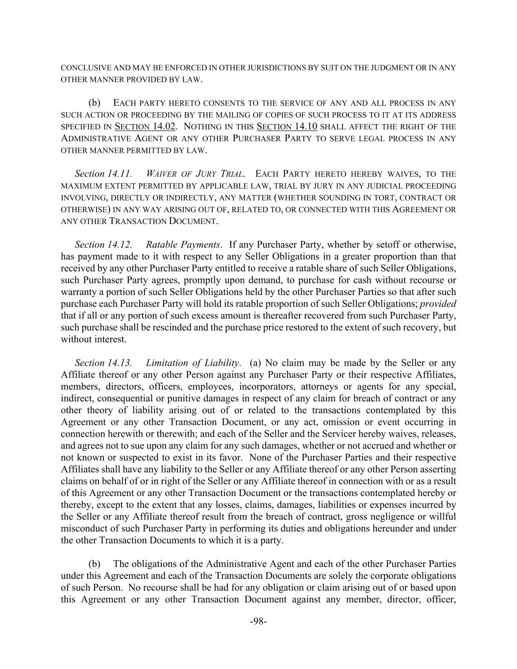 -98-结论性意见,可在其他法域根据判决提起诉讼或以法律规定的任何其他方式强制执行。(b)本协议的每一方同意在任何该等行动或程序中通过在第14.02条所指明的地址向其邮寄该等程序的副本而送达任何及所有程序。本第14.10条的任何规定均不影响行政代理人或任何其他购买方以法律允许的任何其他方式服务法律程序的权利。第14.11节。放弃陪审团审判。此处的每一方当事人在适用法律允许的最大限度内,放弃在任何司法程序中由陪审团审判直接或间接涉及以任何方式产生、与本协议或任何其他交易文件有关或有关联的任何事项(无论是在侵权、合同或其他方面听起来)。第14.12节。应课税款项。如果任何买方一方就任何卖方债务向其支付的款项,无论是通过抵销还是其他方式,其支付比例高于任何其他有权获得此类卖方债务的应分摊份额的买方一方所收到的款项,则该买方一方同意,应要求立即,以无追索权或无担保的方式以现金购买其他买方方持有的部分此类卖方义务,以便在此类购买后,每一买方方将持有其在此类卖方义务中的应课税比例;但如果此后从该买方方处收回全部或任何部分此类超额金额,则应撤销此类购买,并将购买价格恢复到此类收回的范围内,但不计利息。第14.13节。责任限制。(a)卖方或其任何关联公司或任何其他人不得就因本协议或任何其他交易文件所设想的交易产生或与之相关的任何违约索赔或任何其他责任理论,或与本协议或与之相关的任何作为、不作为或事件而就任何特殊、间接、后果性或惩罚性损害赔偿向任何买方或其各自的关联公司、成员、董事、高级职员、雇员、注册人、律师或代理人提出索赔;卖方和服务商各自特此放弃、解除、并同意不就任何此类损害赔偿的任何索赔提起诉讼,无论是否应计以及是否知道或怀疑存在对其有利的情况。任何买方当事人及其各自的关联公司均不对卖方或其任何关联公司或代表卖方或其任何关联公司主张或有权就本协议或任何其他交易文件或本协议或本协议或本协议或本协议或本协议或本协议或本协议或本协议或本协议所设想的交易或因本协议或本协议或本协议或本协议或本协议所设想的交易而主张债权的任何其他人承担任何责任,除非卖方或其任何关联公司因违约而招致的任何损失、债权、损害、责任或费用,该买方在履行其在本协议项下以及其作为当事方的其他交易文件项下的职责和义务时的重大过失或故意不当行为。(b)行政代理人和每一其他买方当事人根据本协议和每份交易文件承担的义务完全是该人的公司义务。不得就因本协议或任何其他交易文件而产生或基于本协议或任何其他交易文件而对任何成员、董事、高级职员、