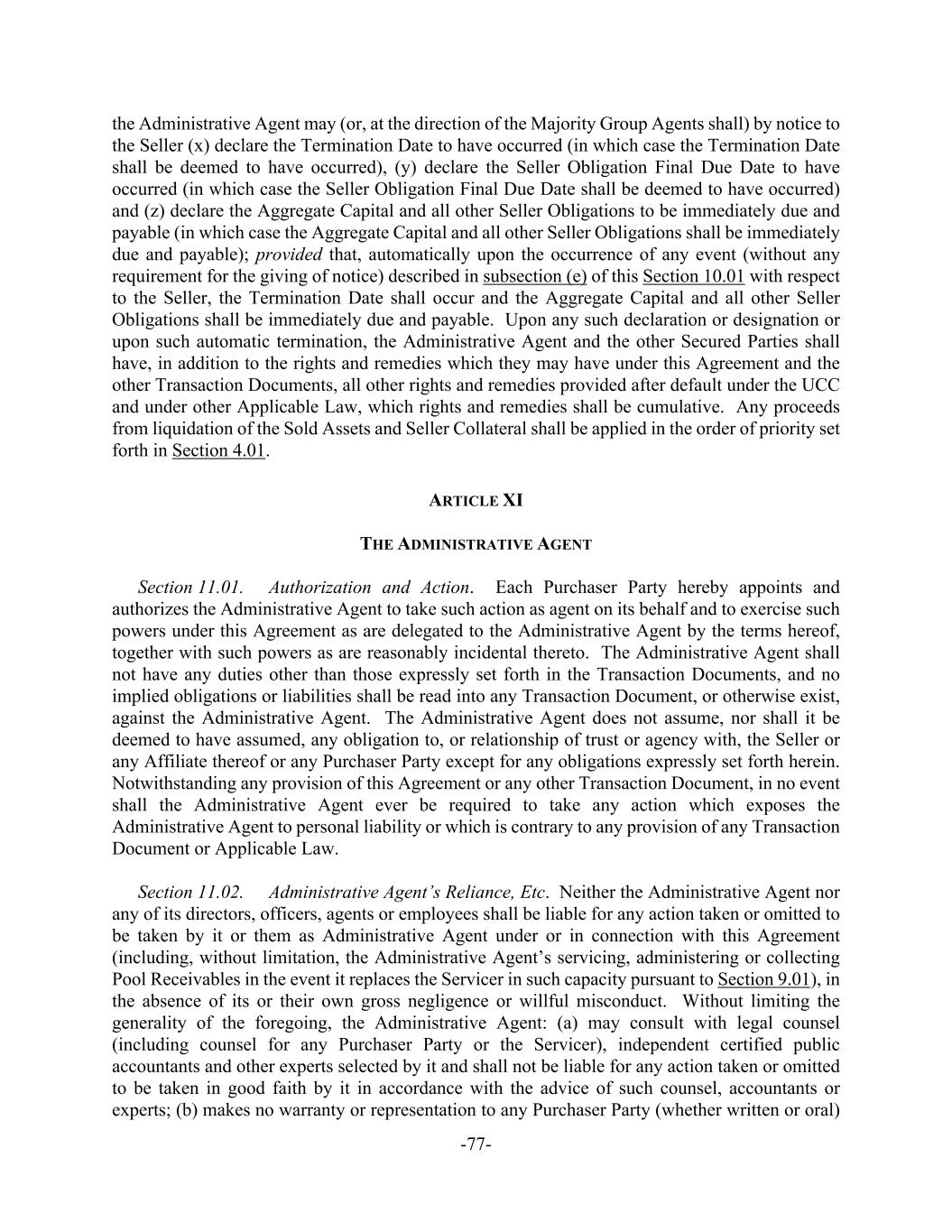 -77-行政代理人可以(或,在多数群体代理人的指示下)通过通知卖方(x)宣布终止日期已经发生(在这种情况下,终止日期应被视为已经发生),(y)宣布卖方债务的最终到期日已经发生(在这种情况下,卖方债务的最终到期日应被视为已经发生)和(z)宣布总资本和所有其他卖方债务立即到期应付(在这种情况下,总资本和所有其他卖方债务应立即到期应付);但前提是,一旦发生本第10.01条(e)款所述关于卖方的任何事件(无任何发出通知的要求),自动,终止日期将发生,而总资本和所有其他卖方义务应立即到期应付。在任何此类声明或指定或此类自动终止时,行政代理人和其他有担保当事人除在本协议和其他交易文件项下可能拥有的权利和补救措施外,还应拥有在违约后根据UCC和其他适用法律提供的所有其他权利和补救措施,这些权利和补救措施应是累积的。出售资产和卖方抵押品清算所得的任何收益应按第4.01节规定的优先顺序适用。第一条XI行政代理第11.01款。授权和行动。各买方一方特此指定并授权行政代理人代表其采取代理行动,并根据本协议行使本协议条款授予行政代理人的权力,以及合理附带的权力。行政代理人不得承担交易单证明文规定以外的任何职责,不得将任何默示义务或责任解读为任何交易单证,或以其他方式存在针对行政代理人的义务或责任。行政代理人不承担,也不应被视为承担对卖方或其任何关联公司或任何买方一方的任何义务,或与其之间的信托或代理关系,但本协议明确规定的任何义务除外。尽管有本协议或任何其他交易文件的任何规定,在任何情况下均不得要求行政代理人采取任何使行政代理人承担个人责任或违反任何交易文件或适用法律的任何规定的行动。第11.02节。行政代理人的依赖等。行政代理人或其任何董事、高级人员、代理人或雇员均不对其或其作为行政代理人根据本协议或与本协议有关而采取或不采取的任何行动(包括但不限于行政代理人在其根据第9.01条以该身份取代服务人的情况下提供服务、管理或收取集合应收款)承担责任,而其本人并无重大过失或故意不当行为。在不限制前述一般性的情况下,行政代理人:(a)可咨询其选定的法律顾问(包括任何买方一方或服务商的顾问)、独立注册会计师和其他专家,不对其根据该等顾问、会计师或专家的建议善意采取或不采取的任何行动承担责任;(b)不向任何买方一方作出任何保证或陈述(不论是书面或口头)