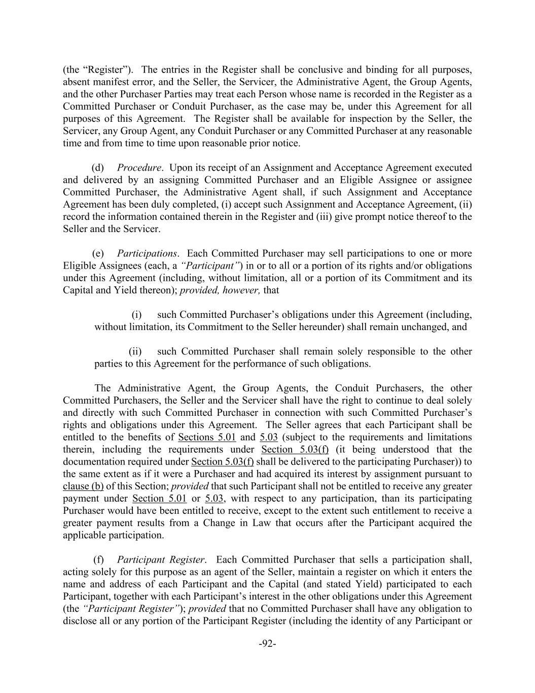 -92-(“登记册”)。登记册中的记项应是结论性的,对所有目的均具有约束力,没有明显错误。卖方、服务商、行政代理人、集团代理和其他买方方可视情况将登记册中记录的每个人视为本协议下的承诺买方或管道买方,以用于本协议的所有目的。登记册可供卖方、服务商、任何集团代理、任何管道买方或任何承诺的买方在任何合理时间并在合理的事先通知后不时查阅。(d)程序。行政代理人在收到由转让承诺买方和合资格受让人或受让人承诺买方签立和交付的转让和接受协议后,如该转让和接受协议已妥为完成,则行政代理人应(i)接受该转让和接受协议,(ii)将其中所载信息记录在登记册中,并(iii)迅速通知卖方和服务商。(e)参与。各承诺买方可向一名或多名符合条件的受让人(每名“参与者”)出售其在本协议项下的全部或部分权利和/或义务(包括但不限于其全部或部分承诺及其资本和收益率)的参与;但前提是(i)该承诺买方在本协议项下的义务(包括但不限于其在本协议项下对卖方的承诺)应保持不变,且(ii)该承诺买方仍应就履行该等义务向本协议其他方承担全部责任。行政代理人、集团代理人、管道采购人、其他承诺采购人、卖方和服务商有权继续就该承诺采购人在本协议项下的权利和义务单独和直接与该承诺采购人进行交易。卖方同意,每一参与者应有权享有第5.01和5.03条的利益(但须遵守其中的要求和限制,包括第5.03(f)条的要求(但有一项理解,即根据第5.03(f)条要求的文件应交付给参与的买方)),其程度与其作为买方并已根据本条(b)款通过转让获得其权益的程度相同;但该参与者不得根据第5.01或5.03条就任何参与收取任何更大的付款,超过其参与的买方本应有权获得的金额,除非此种获得更多付款的权利是由于参与者获得适用的参与后发生的法律变更所致。(f)参加者名册。出售参与的每一承诺买方应作为卖方的代理人仅为此目的保持一份登记册,在该登记册上输入每一参与者的名称和地址以及向每一参与者参与的资本(和规定的收益率),以及每一参与者在本协议项下其他义务中的利益(“参与者登记册”);但任何承诺买方均无义务披露参与者登记册的全部或任何部分(包括任何参与者的身份或