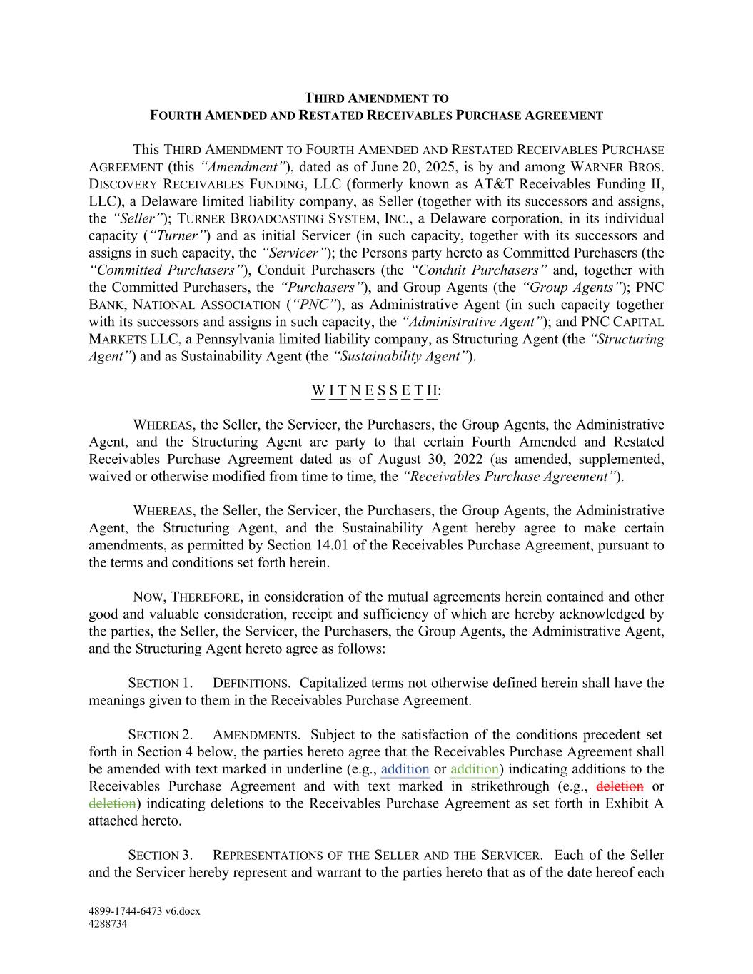 对第四次修订和重述的应收款购买协议的第三次修订这份对第四次修订和重述的应收款购买协议(本“修订”),日期为2025年6月20日,由WARNER BROS提出并在他们中间提出。Discovery Receivables Funding,LLC(原名:美国电话电报 Receivables Funding II,LLC),一家特拉华州有限责任公司,作为卖方(连同其继任者和受让人,“卖方”);TURNER BROADCASTING SYSTEM,INC.,一家特拉华州公司,以其个人身份(“Turner”)和作为初始服务商(连同其继任者和受让人,以该身份,“服务商”);作为承诺购买者(“承诺购买者”)、导管购买者(“导管购买者”,连同承诺购买者,“购买者”)和团体代理商(“团体代理商”)的当事人作为行政代理人(以该身份连同其继任者和以该身份受让人,“行政代理人”);以及宾夕法尼亚州有限责任公司PNC CAPITAL MarkETS LLC作为结构代理(“结构代理”)和可持续发展代理(“可持续发展代理”)。W I T N E S E T H:WHEREAS,卖方、服务商、买方、集团代理、行政代理和结构代理是日期为2022年8月30日的特定第四份经修订和重述的应收账款购买协议(经不时修订、补充、放弃或以其他方式修改,“应收账款购买协议”)的一方。然而,卖方、服务商、买方、集团代理、行政代理、结构代理和可持续发展代理在此同意根据应收账款购买协议第14.01节的允许,根据此处规定的条款和条件进行某些修订。现,因此,考虑到本协议所载的相互协议和其他良好的、有价值的对价,现由当事人确认收到并充分性,卖方、服务商、买方、集团代理、行政代理、结构代理同意如下:第一节。定义。本文未另行定义的大写术语应具有应收账款购买协议中赋予它们的含义。第2节。修正。在满足下文第4节规定的先决条件的情况下,本协议各方同意,应对应收账款购买协议进行修订,修改时应使用下划线标记的文字(例如,增加或增加)表明对应收账款购买协议的补充,并使用删除线标记的文字(例如,删除或删除)表明对应收账款购买协议的删除,如本协议所附的附件 A所述。第3节。卖方和服务商的代表。卖方和服务商各自在此向本协议各方声明并保证,截至本协议签署之日,各4899-1744-6473 v6.docx4288734