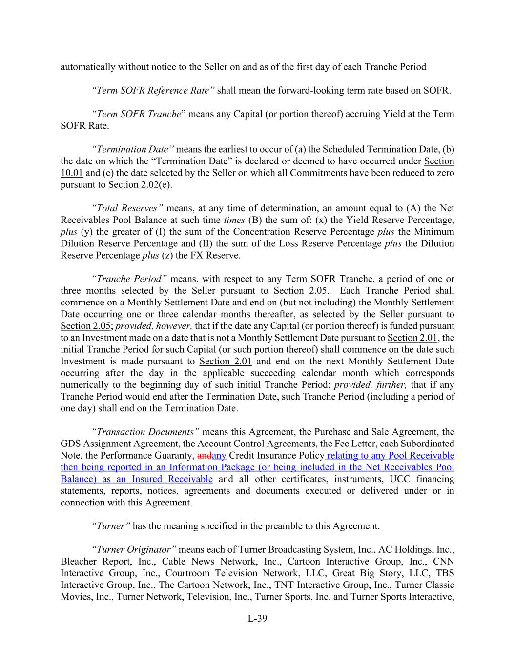 L-39自动在每个批次期间的第一天和截至第一天不通知卖方“期限SOFR参考利率”是指基于SOFR的前瞻性期限利率。“期限SOFR部分”是指以期限SOFR利率累计收益率的任何资本(或其部分)。“终止日期”是指(a)预定终止日期、(b)根据第10.01条宣布或视为已发生“终止日期”的日期和(c)卖方根据第2.02(e)条将所有承诺减至零的选定日期中最早发生的日期。“总准备金”是指,在任何确定时间,等于(a)在这些时间的应收账款净池余额(b)以下各项之和的金额:(x)收益准备金百分比,加上(y)(i)集中准备金百分比之和加上最低稀释准备金百分比和(II)损失准备金百分比加上稀释准备金百分比之和加上(z)外汇准备金两者中的较大者。“批次期限”是指,就任何期限SOFR批次而言,卖方根据第2.05条选择的一个或三个月的期限。每个分档期应从每月结算日开始,并在(但不包括)卖方根据第2.05节选定的其后一个或三个日历月发生的每月结算日结束;但条件是,如果任何资本(或其部分)是根据根据第2.01节在不是每月结算日的日期进行的投资提供资金的,此类资本(或其此类部分)的初始分割期应自根据第2.01条进行此类投资之日起开始,并于在数值上对应于此类初始分割期开始日的适用的下一个历月的一天之后发生的下一个月度结算日期结束;此外,如果任何分割期将在终止日期之后结束,则该分割期(包括一天的期间)应在终止日期结束。“交易文件”是指本协议、购销协议、GDS转让协议、账户控制协议、费用函、每份次级票据、履约保函,以及与随后在信息包中报告(或包含在应收账款净额池余额中)作为受保应收款项以及根据本协议签署或交付的所有其他凭证、工具、UCC融资报表、报告、通知、协议和文件有关的任何集合应收账款,以及与根据本协议签署或交付或与本协议有关的所有其他凭证、票据、TERM1融资报表、报告、通知、协议和文件。“特纳”具有本协议序言部分规定的含义。“特纳鼻祖”是指Turner Broadcasting System,Inc.、AC Holdings,Inc.、Bleacher Report,Inc.、Cable News Network,Inc.、Cartoon Interactive Group,Inc.、CNN Interactive Group,Inc.、Courtroom Television Network,LLC、Great Big Story,LLC、TBS Interactive Group,Inc.、The Cartoon Network,Inc.、TNT Interactive Group,Inc.、Turner Classic Movies,Inc.、Turner Network,Television,Inc.、Turner Sports,Inc.和Turner Sports Interactive,