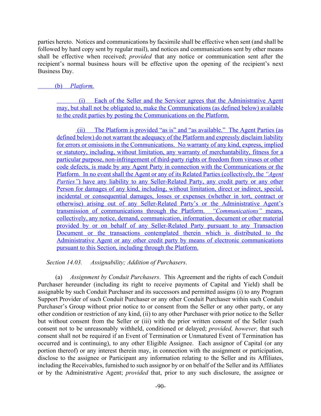 -90-双方。以传真方式发出的通知和通信,自发出时起生效(并应随后以普通邮件方式发出硬拷贝),以其他方式发出的通知和通信,自收到时起生效;但在收件人正常营业时间之后发出的任何通知或通信,自收件人下一个营业日营业时起生效。(b)平台。(i)卖方和服务商各自同意,行政代理人可以(但无义务)通过在平台上发布通信来向信用方提供通信(定义见下文)。(ii)平台按“原样”和“可用”提供。代理方(定义见下文)不保证平台的充分性,并明确否认对通信中的错误或遗漏承担责任。任何代理方均不就通讯或平台作出任何形式的明示、默示或法定保证,包括但不限于任何关于适销性、适用于特定目的、不侵犯第三方权利或免受病毒或其他代码缺陷的保证。在任何情况下,在任何情况下,代理人或其任何关联方(统称“代理方”)均不对任何卖方关联方、任何信用方或任何其他人承担任何责任,包括但不限于因任何卖方关联方或行政代理人通过平台传输通信而产生的直接或间接、特殊、附带或后果性损害、损失或费用(无论是侵权、合同或其他)。“通信”统称为任何卖方关联方或其代表根据任何交易文件或其中所设想的交易提供的任何通知、要求、通信、信息、文件或其他材料,这些通知、要求、通信、信息、文件或其他材料根据本节以电子通信方式(包括通过平台)分发给行政代理人或任何其他信用方。第14.03节。可转让性;增加购买者。(a)导管购买者转让。本协议和本协议项下每个管道买方的权利(包括其收取资本和收益率付款的权利)应由该管道买方及其继任者和允许的受让人转让(i)给该管道买方的任何程序支持提供商或该管道买方集团内的任何其他管道买方,而无需事先通知或征得卖方或任何其他方的同意,或任何其他条件或任何种类的限制,(ii)在事先通知卖方但未经卖方同意的情况下向任何其他买方或(iii)在卖方事先书面同意(该同意不得被无理拒绝、附加条件或延迟;但前提是,如果终止事件或未成熟的终止事件已经发生并仍在继续,则不需要该同意),向任何其他合格受让人。资本(或其任何部分)或其中任何权益的每一转让人可就转让或参与向受让人或参与者披露由或代表卖方及其关联公司或由行政代理人向该转让人提供的与卖方及其关联公司有关的任何信息,包括应收款;但在任何此类披露之前,受让人或