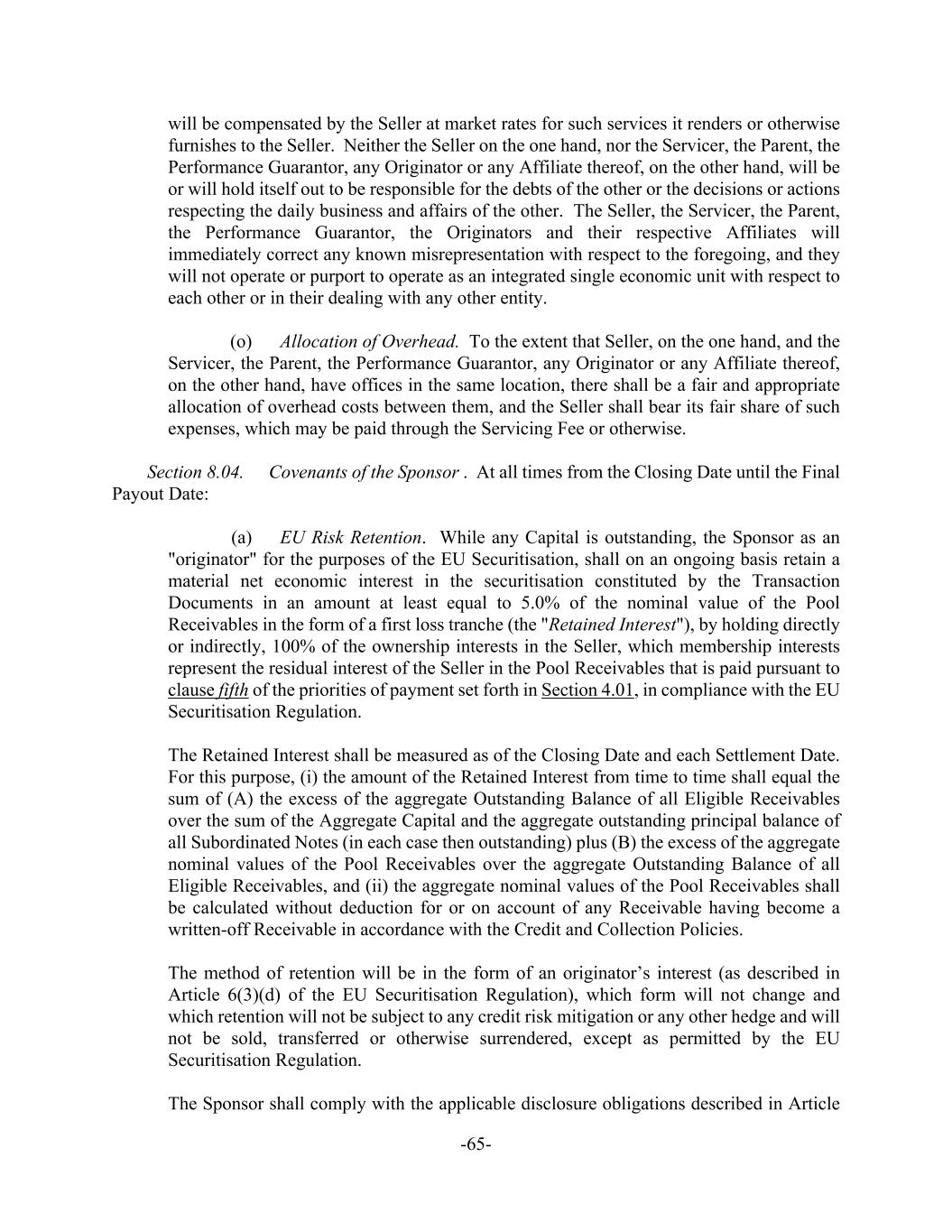 -65-将由卖方按市场价格补偿其向卖方提供或以其他方式提供的此类服务。无论是卖方,还是服务商、母公司、履约保证人、任何发起人或其任何关联公司,都不会或将会自称对对方的债务或尊重对方日常业务和事务的决定或行动负责。卖方、服务商、母公司、履约保证人、发起人及其各自的关联公司将立即更正任何已知的与上述有关的虚假陈述,并且他们将不会就彼此或在他们与任何其他实体的交易中作为一个综合的单一经济单位运营或声称运营。(o)分配间接费用。在卖方一方面与服务商、母公司、履约保证人、任何发起人或其任何关联公司在同一地点设有办事处的情况下,它们之间应公平、适当地分配间接费用,卖方应承担其公平分担的此类费用,这些费用可通过服务费或其他方式支付。第8.04节。保荐人的盟约。在截止日期至最终支付日期的所有时间:(a)欧盟风险保留。当任何资本未偿还时,保荐人作为欧盟证券化目的的“发起机构”,应通过直接或间接持有卖方100%的所有权权益,持续保留交易文件所构成的证券化的重大净经济权益,其金额至少等于第一损失部分形式的集合应收账款面值的5.0%(“保留权益”),哪些会员权益代表卖方在集合应收账款中的剩余权益,该权益根据第4.01节规定的支付优先顺序第5条支付,符合欧盟证券化条例。留存的利息自结算日和各结算日开始计量。为此目的,(i)不时留存的利息金额应等于(a)所有合资格应收款项的未偿余额总额超过所有次级票据的资本总额和未偿本金余额总额(在每种情况下均未偿还)的总和加上(b)集合应收款项的总面值超过所有合资格应收款项的未偿余额总额的总和,(ii)根据信贷和收款政策,应对任何已成为已注销应收款项的应收款项计算总汇应收款项的名义价值,不得扣除或记账。保留的方式将采用发起人权益的形式(如欧盟证券化条例第6(3)(d)条所述),哪种形式不会改变,哪种保留不会受到任何信用风险缓解或任何其他对冲的约束,也不会被出售、转让或以其他方式放弃,除非欧盟证券化条例允许。保荐机构应当遵守第