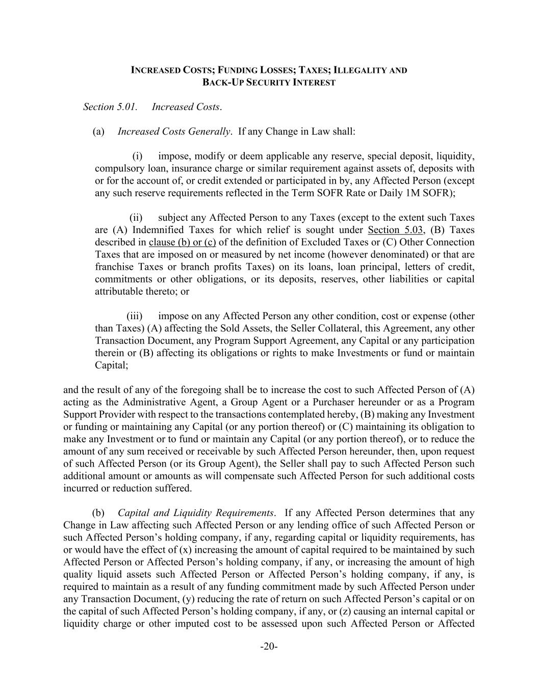 -20-费用增加;筹资损失;税收;违法和备用担保利息第5.01款。成本增加。(a)成本普遍增加。如法律发生任何变更,应:(i)针对任何受影响人士的资产、存放于或为其账户的存款、或由其提供或参与的信贷,施加、修改或认为适用任何准备金、特别存款、流动性、强制贷款、保险费或类似要求(定期SOFR利率或每日1M SOFR中反映的任何此类准备金要求除外);(ii)对任何受影响人士征收任何税款(除非该等税款是(a)根据第5.03条寻求救济的弥偿税款,(b)对其贷款、贷款本金、信用证、承诺或其他义务,或其存款、准备金、其他负债或由此应占的资本征收或以净收入(无论如何计价)计量的(b)或(c)条中所述的税项或(c)其他连接税项,或为特许经营税或分支机构利得税项;或(iii)对任何受影响人士施加任何其他条件、成本或费用(税项除外)(a)影响所售资产、卖方抵押品、本协议、任何其他交易文件、任何计划支持协议,任何资本或其中的任何参与,或(b)影响其进行投资或为其提供资金或维持资本的义务或权利;而上述任何一种情况的结果应是增加(a)作为行政代理人、集团代理人或买方根据本协议行事或作为程序支持提供者就本协议所设想的交易的受影响人士的成本,(b)作出任何投资或资助或维持任何资本(或其任何部分)或(c)维持其作出任何投资或资助或维持任何资本(或其任何部分)的义务,或减少该受影响人根据本协议收到或应收的任何款项的金额,则应该受影响人(或其集团代理人)的要求,卖方须向该受影响人支付额外的金额,以补偿该受影响人所招致或遭受的额外费用。(b)资本和流动性要求。如任何受影响人士确定影响该受影响人士或该受影响人士或该受影响人士的控股公司(如有)的任何有关资本或流动性要求的法律变更,已经或将产生(x)增加该受影响人士或受影响人士的控股公司(如有)所需维持的资本数额,或增加该受影响人士或受影响人士的控股公司(如有)的高质量流动资产数额,由于该受影响人根据任何交易文件作出的任何资金承诺,需要维持(y)降低该受影响人的资本或该受影响人的控股公司的资本的回报率(如有),或(z)导致对该受影响人或受影响人评估内部资本或流动性费用或其他估算成本